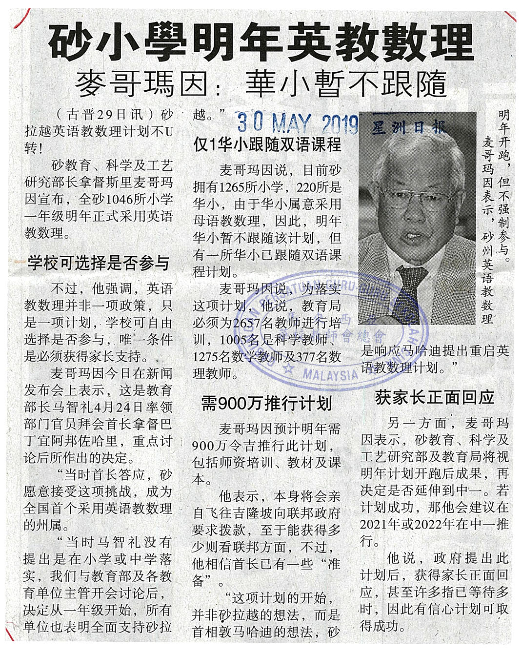 砂小学明年英教数理 麦哥玛因:华小暂不跟随