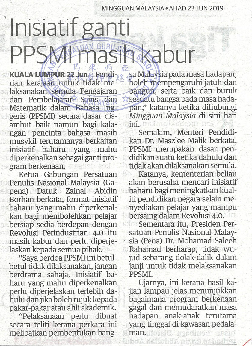 inisiatif ganti PPSMI masih kabur WhatsApp 上一篇文章: 打造良好阅读环境 蕉赖九支华小传书香 上一页 下一篇文章: 马智礼:提升教育体系报告 日内将呈首相 下一页