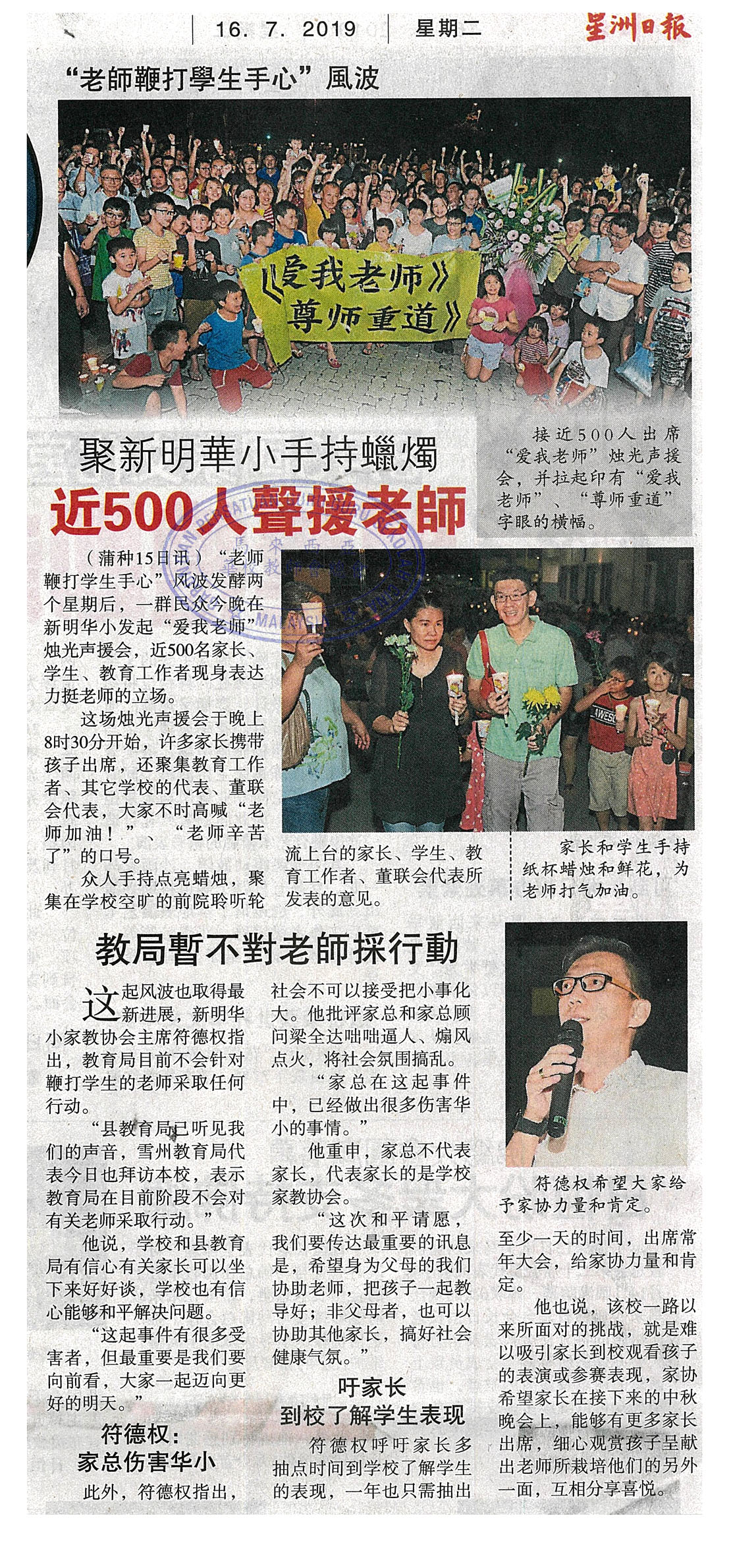 “老师鞭打学生手心”风波 聚新明华小手持蜡烛 近500人声援老师