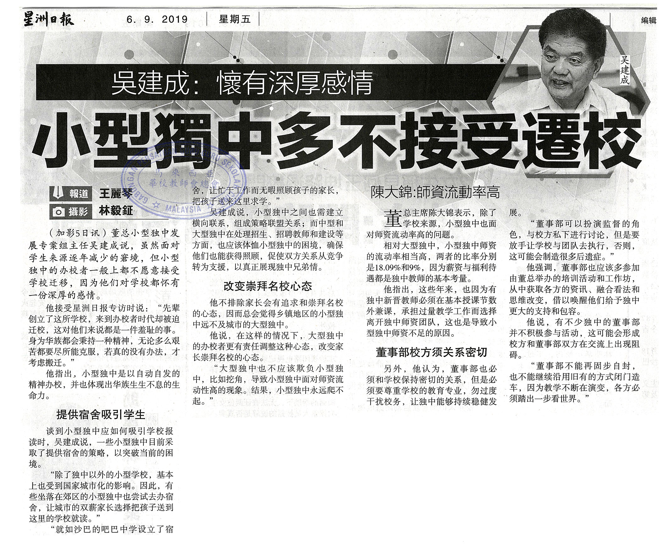 吴建成:怀有深厚感情 小型独中多不接受迁校