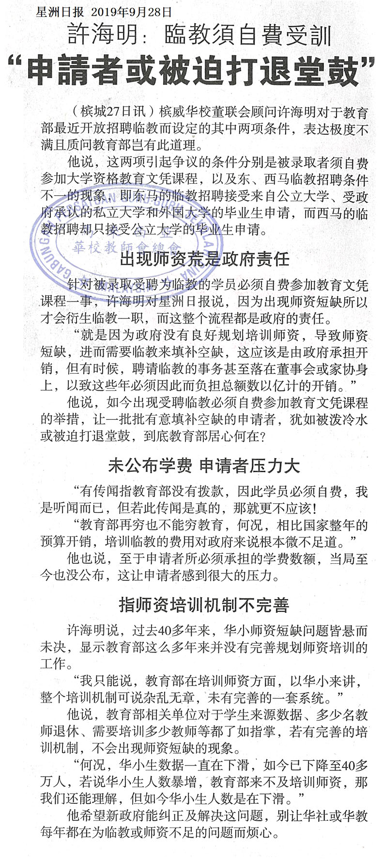 许海明:临教需自费受训 “申请者或被迫打退堂鼓”