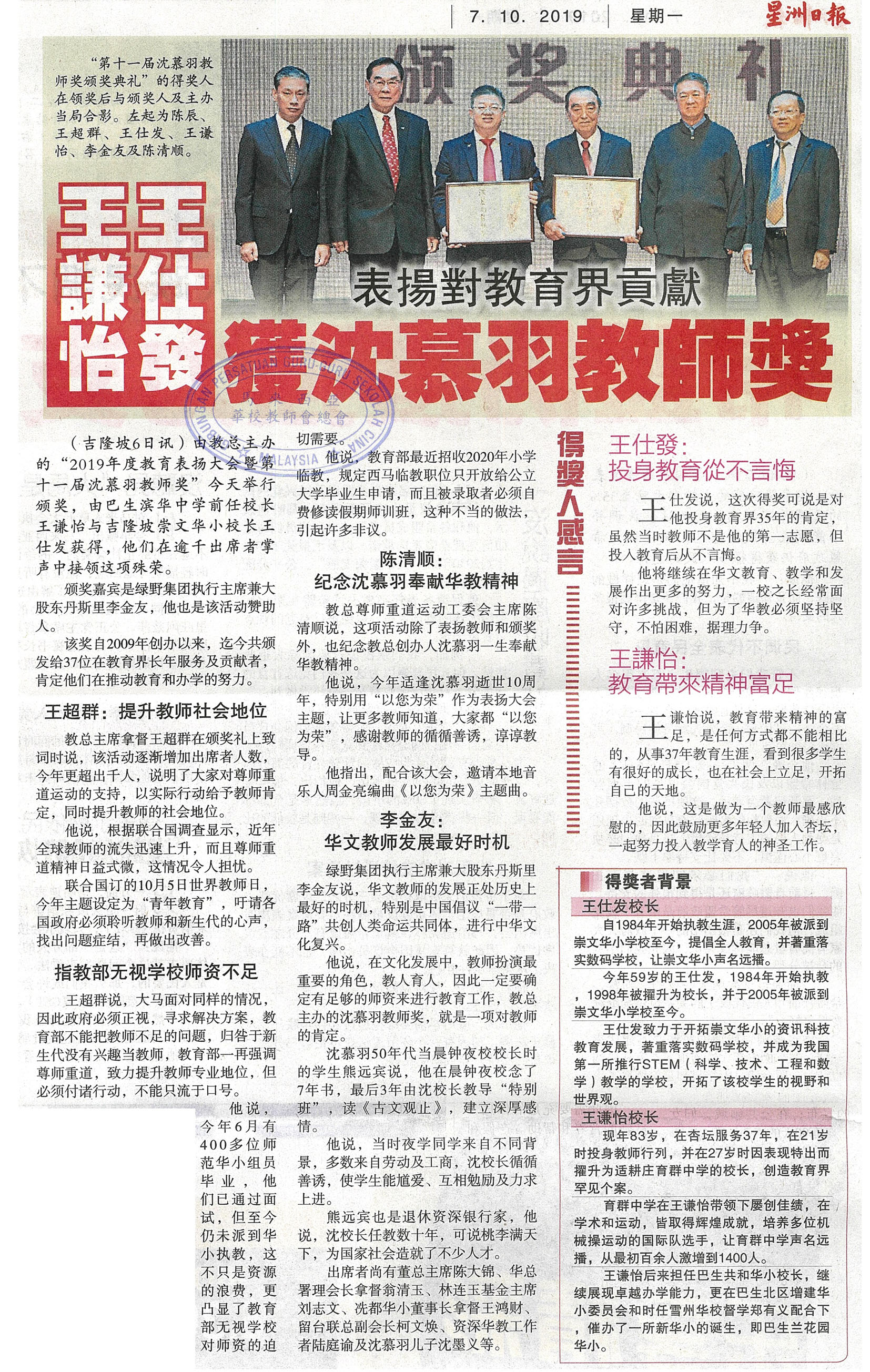 王谦怡 王仕发 获沈慕羽教师奖 表扬对教育界贡献 WhatsApp 上一篇文章: 方天兴:应协商解决免劳民伤财 “华教课题勿再带上庭” 上一页 下一篇文章: 政府受促落实单源流教育 马哈迪:那只是诉求 下一页
