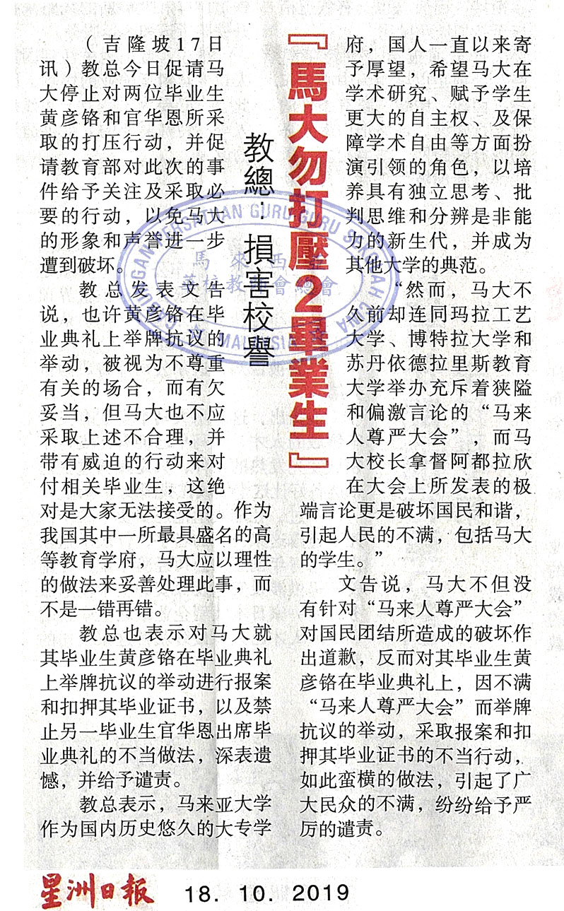 教总:损害校誉 马大勿打压2毕业生