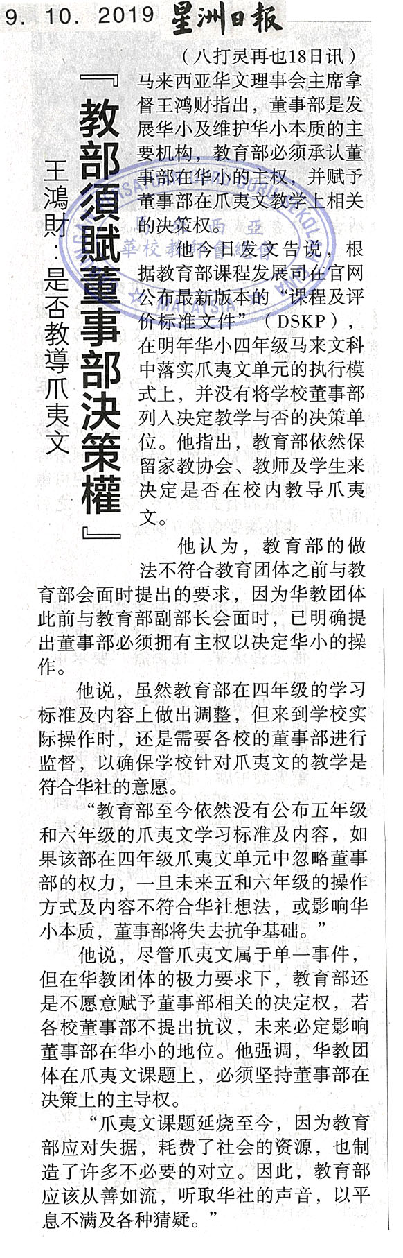 王鸿财:是否教导爪夷文 “教部需赋董事部决策权” WhatsApp 上一篇文章: 新纪元:感谢预算案拨款独中华中 “遗漏3民办大专美中不足” 上一页 下一篇文章: 教总:损害校誉 马大勿打压2毕业生 下一页