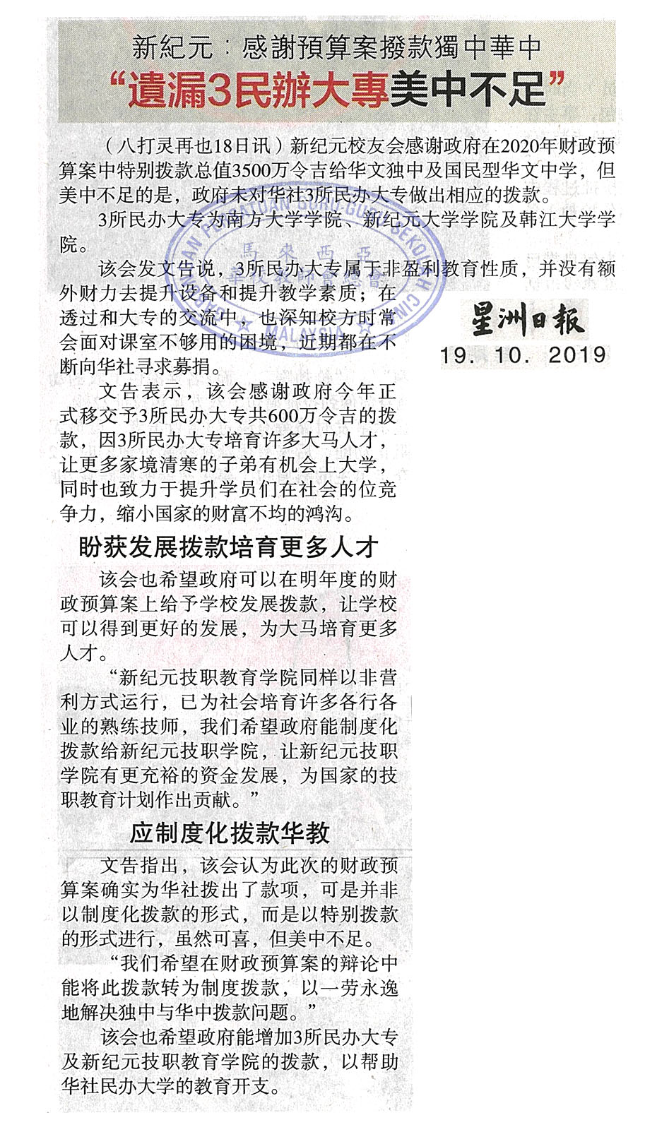 新纪元:感谢预算案拨款独中华中 “遗漏3民办大专美中不足”