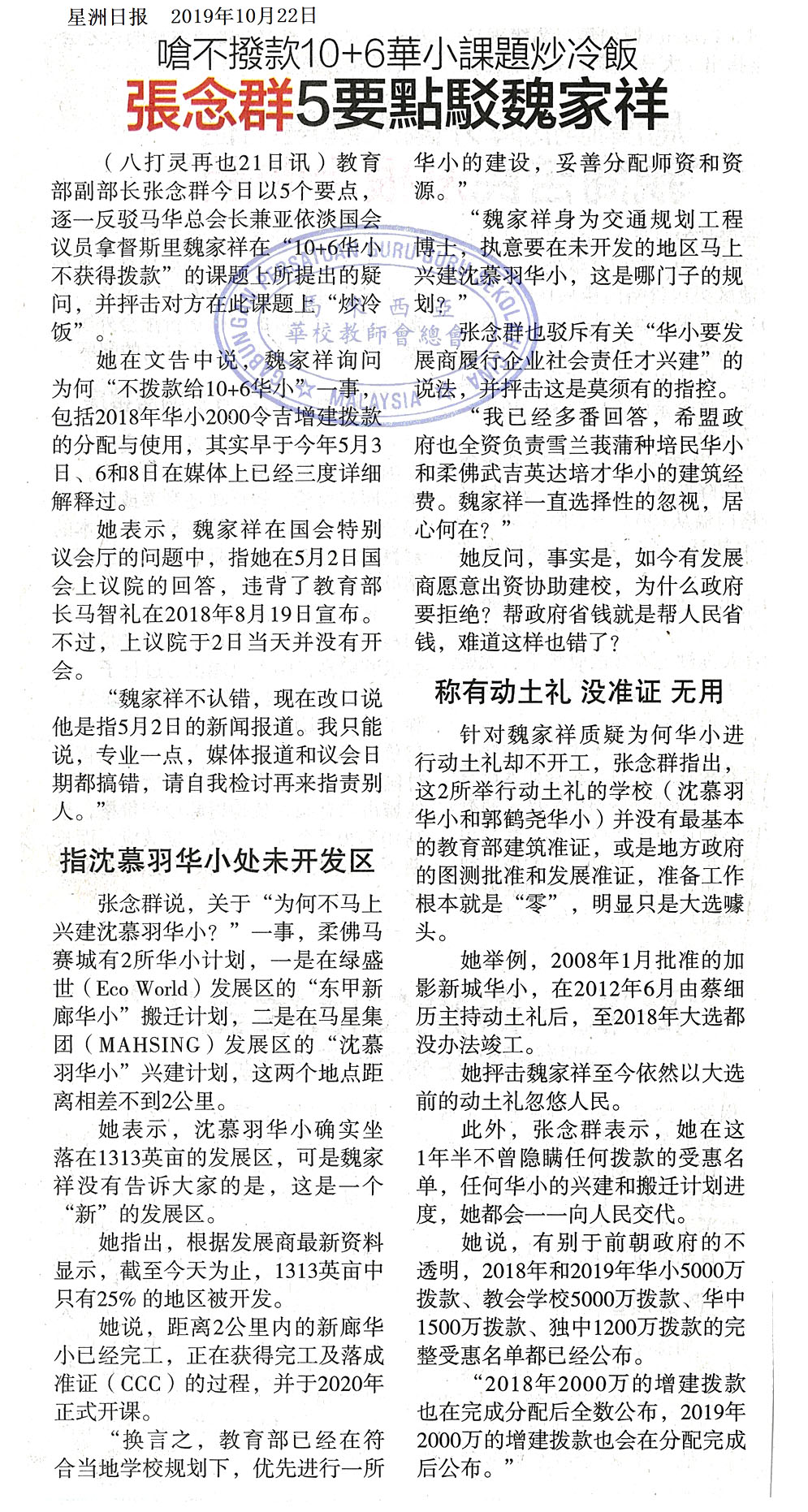 呛不拨款10+6华小课题炒冷饭 张念群5要点驳魏家祥