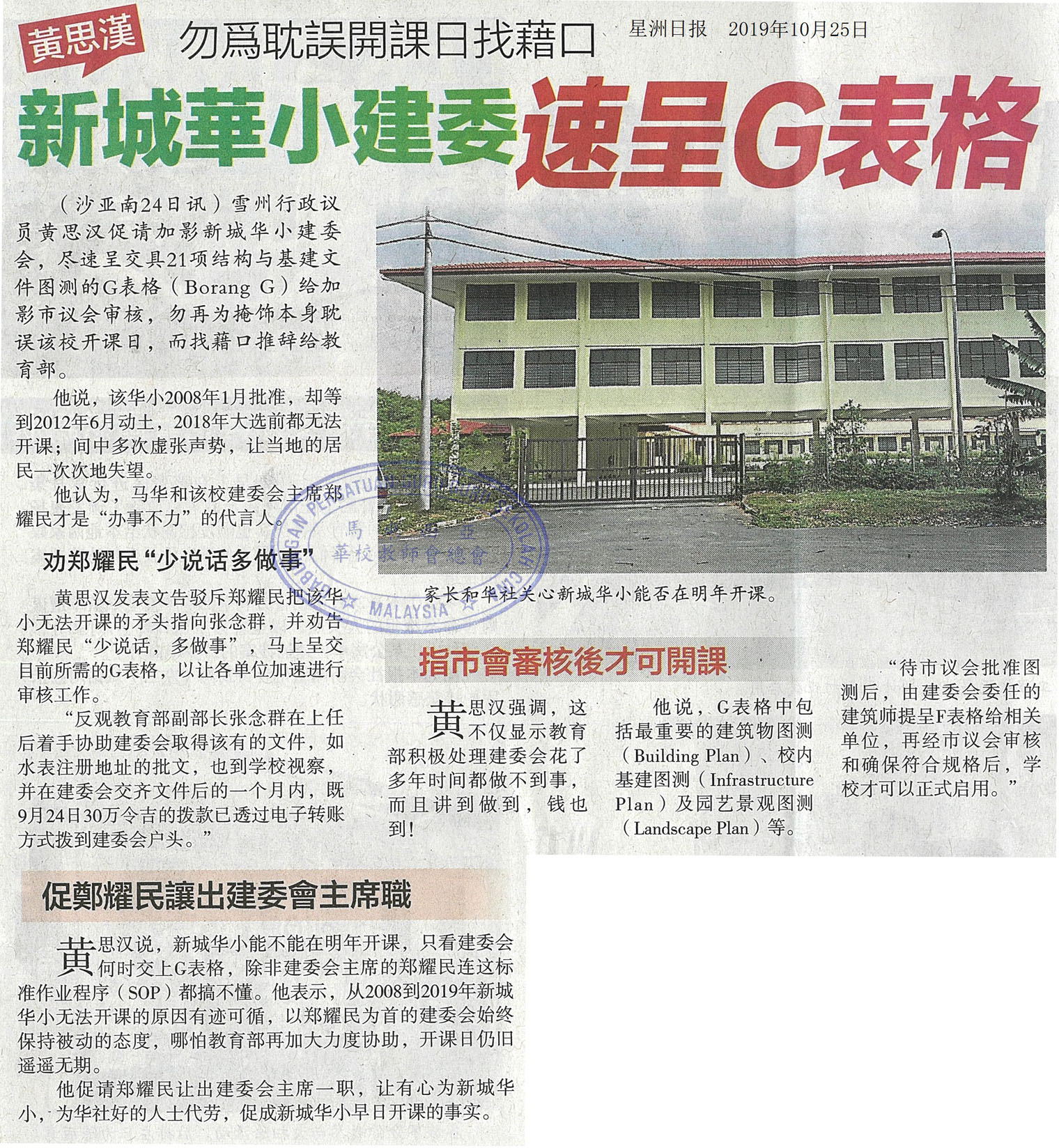 黄思汉:勿为耽误开课日找借口 新城华小建委速呈G表格