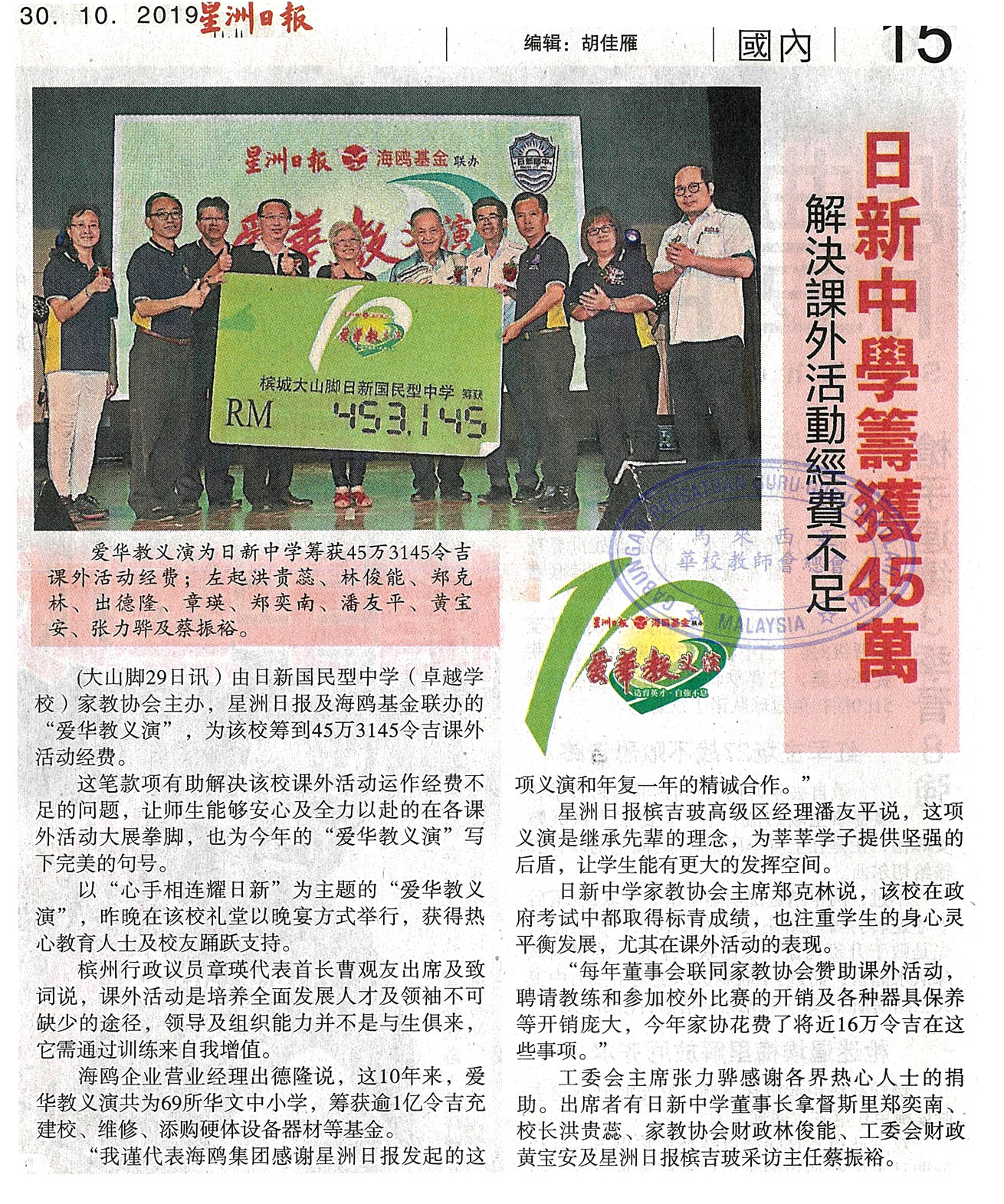 日新中学筹获45万 解决课外活动经费不足