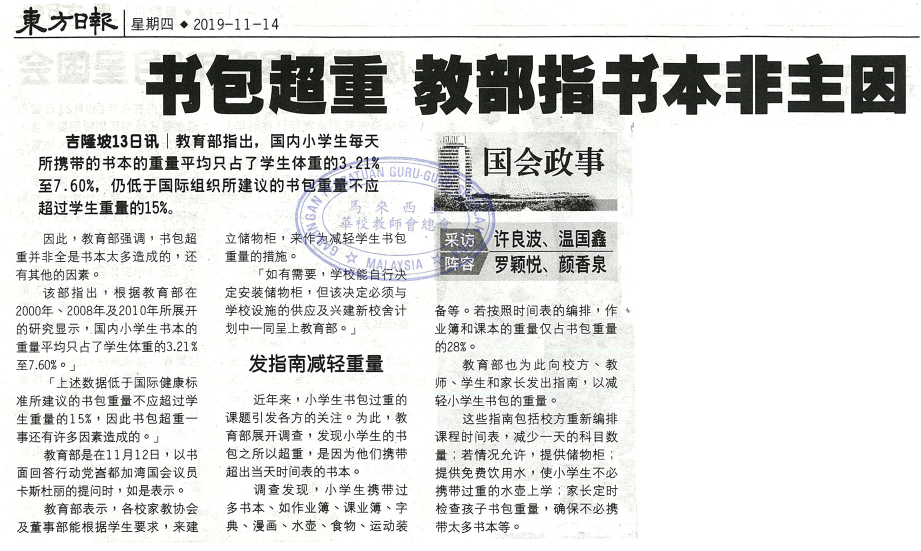 书包超重 教部指书本非主因
