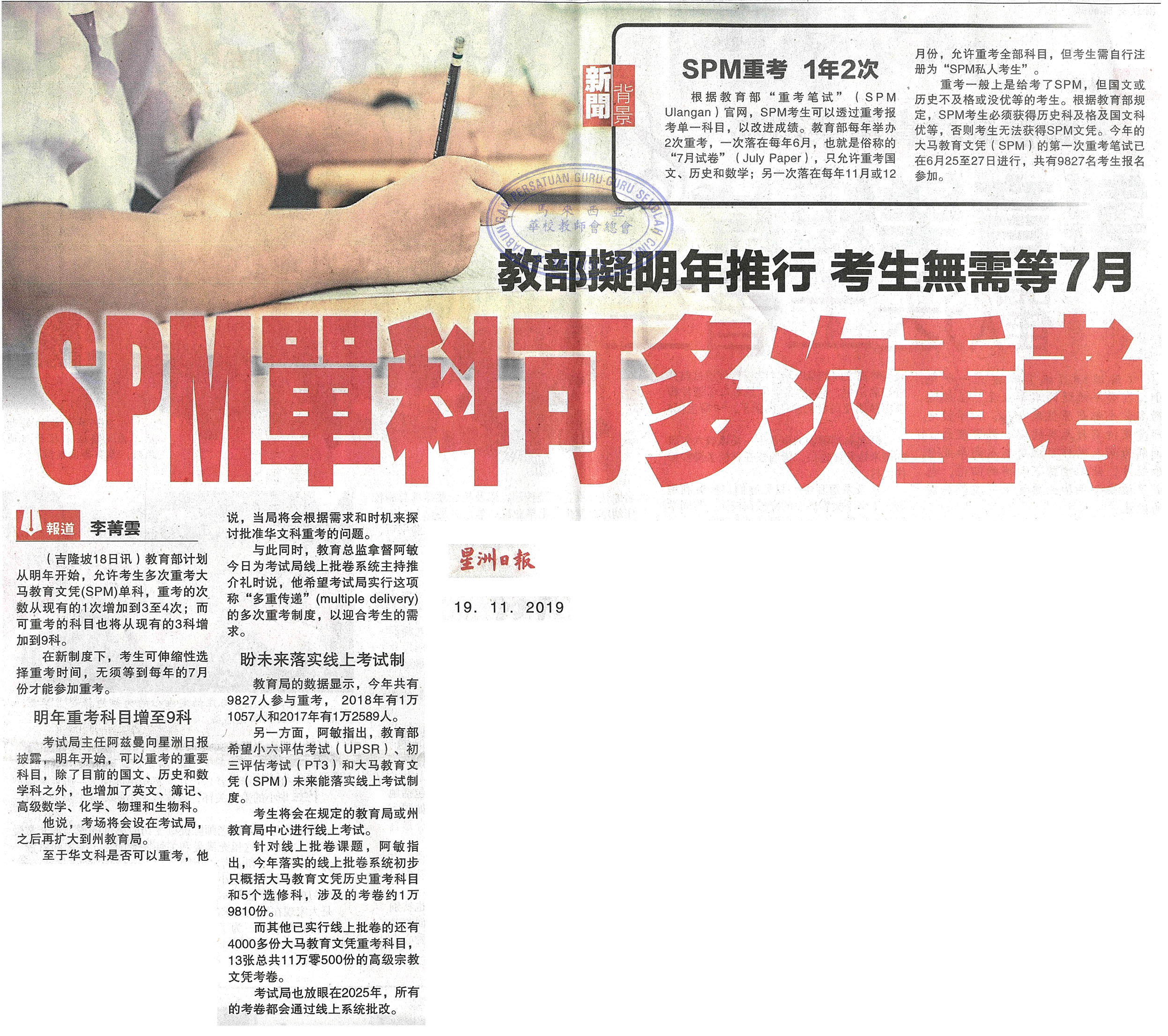 教部拟明年推行 考生无需等7月 SPM单科可多次重考 WhatsApp 上一篇文章: 华联独中义演非常成功 筹获逾811万破2记录 上一页 下一篇文章: 今年起UPSR国文不及格 不能用校考成绩上诉 下一页