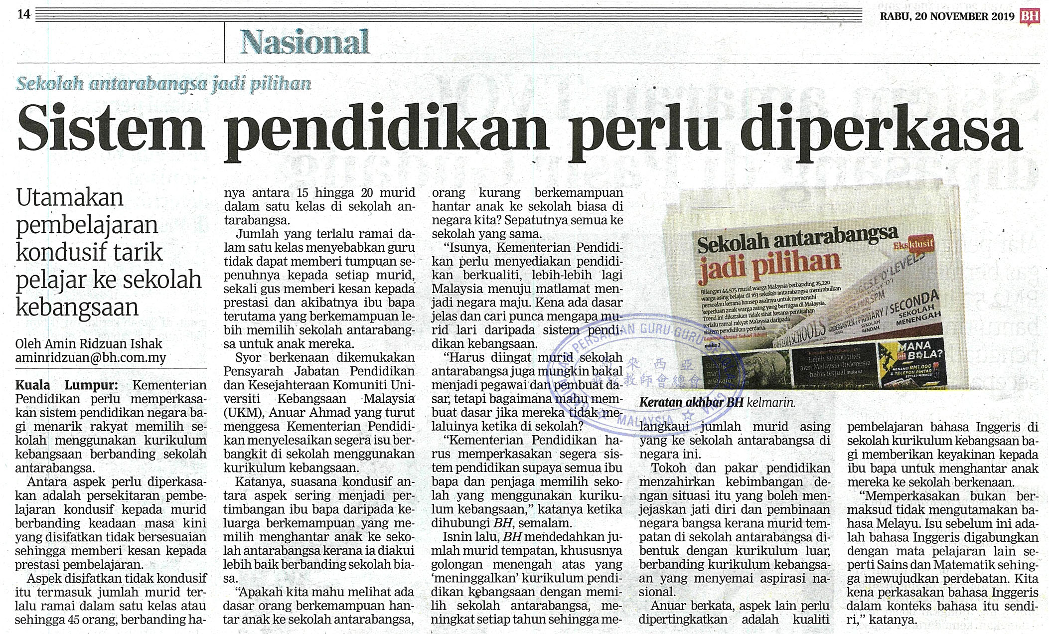 sistem pendidikan perlu diperkasa WhatsApp 上一篇文章: 一至三年级学业评估 下半年改回华文书写 上一页 下一篇文章: 麻坑新中2华裔生毕业‧全校明年又仅是友族生 下一页