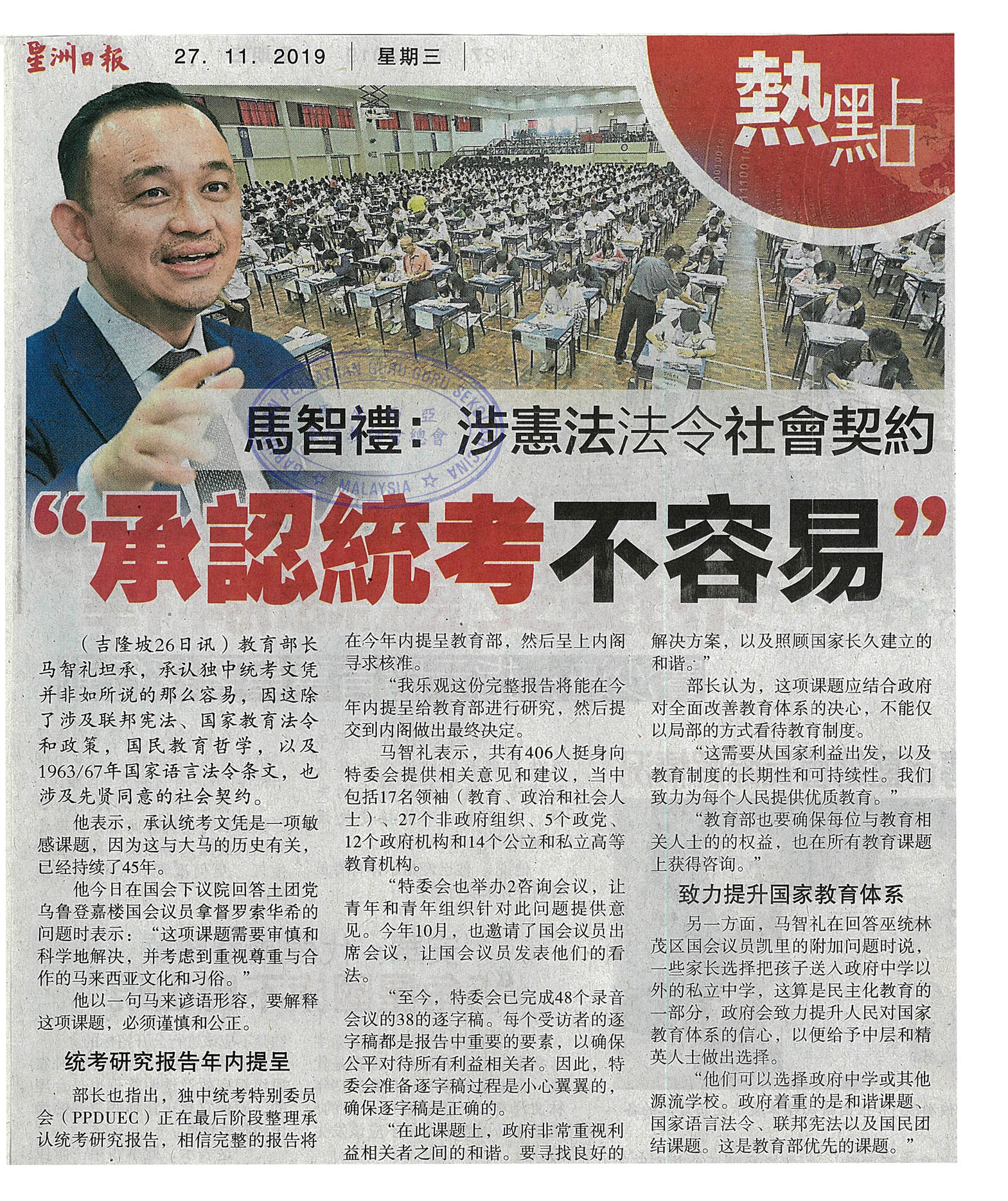 马智礼:涉宪法法令社会契约 “承认统考不容易”