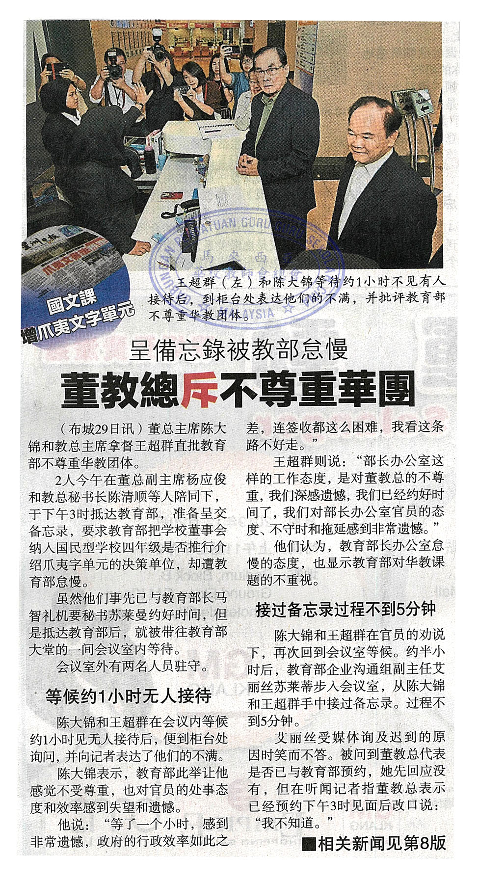 呈备忘录被教部怠慢 董教总斥不尊重华团