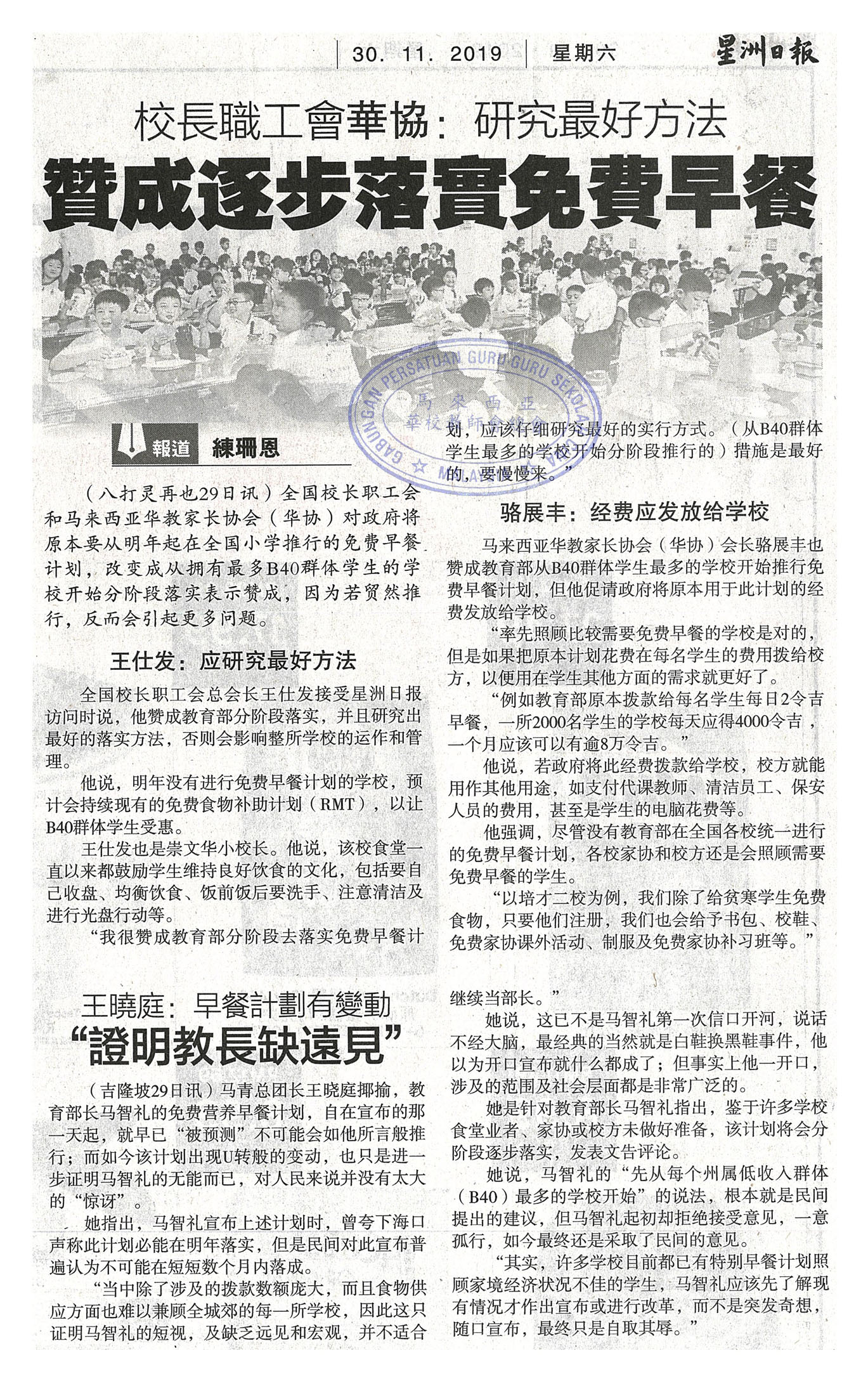 校长职工会华协:研究最好方法 赞成逐步落实免费早餐