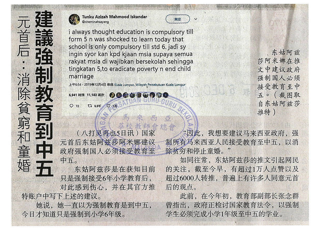 元首后:消除贫穷和童婚 建议强制教育到中五