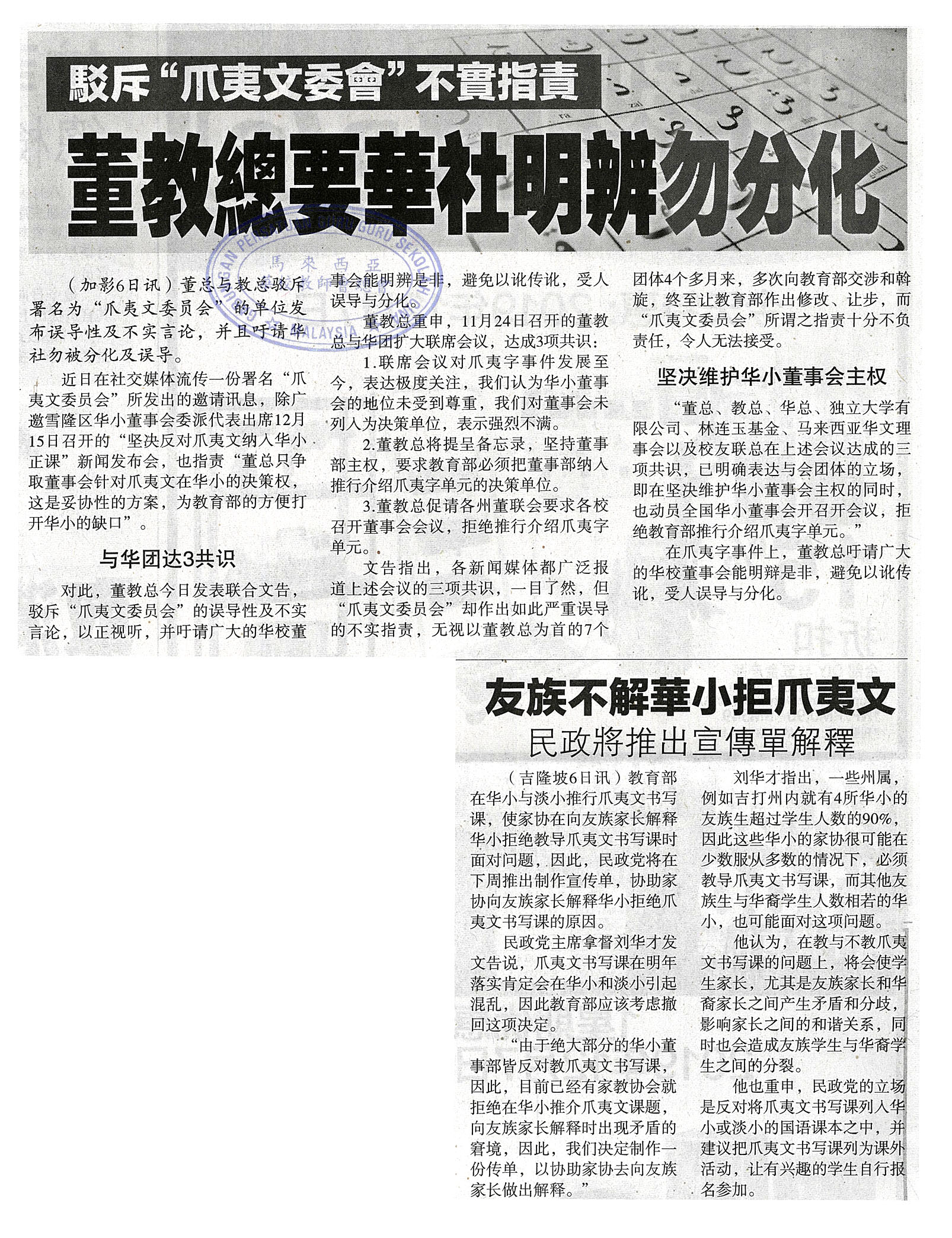 驳斥“爪夷文委会”不是指责 董教总要华社明辨勿分化 WhatsApp 上一篇文章: 张念群:UPSR国文不及格要求直升中一 可用校考成绩上诉 上一页 下一篇文章: 吉北37华小董事部宣布 “我们反对爪夷字单元” 下一页