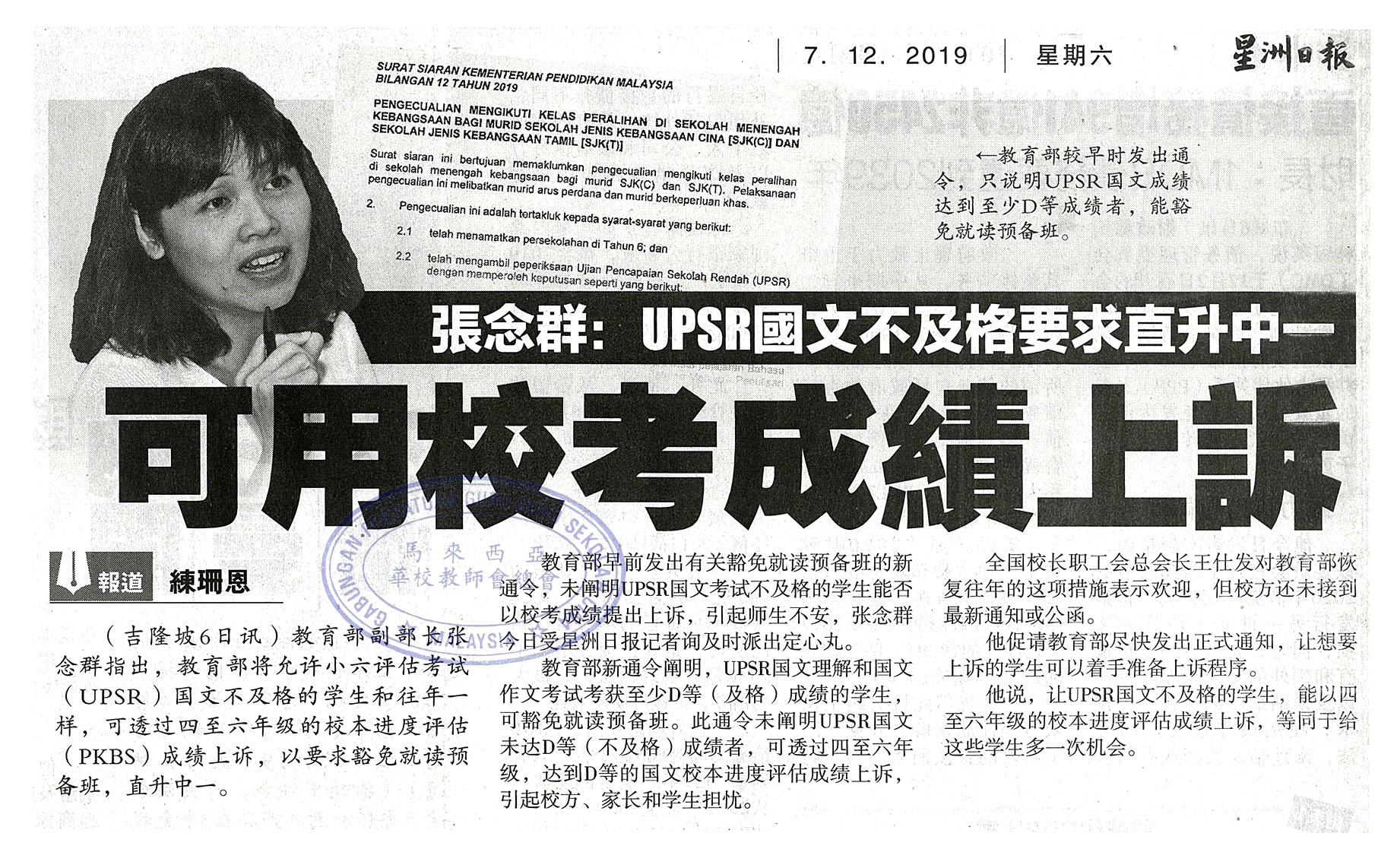张念群:UPSR国文不及格要求直升中一 可用校考成绩上诉 WhatsApp 上一篇文章: 不满华语唱国歌调查结果 理大教授促辞退教育总监 上一页 下一篇文章: 驳斥“爪夷文委会”不是指责 董教总要华社明辨勿分化 下一页