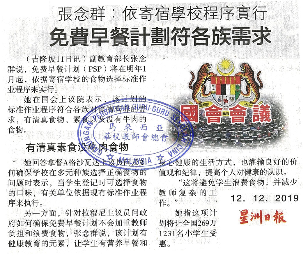 张念群:依寄宿学校程序实行 免费早餐计划符各族需求