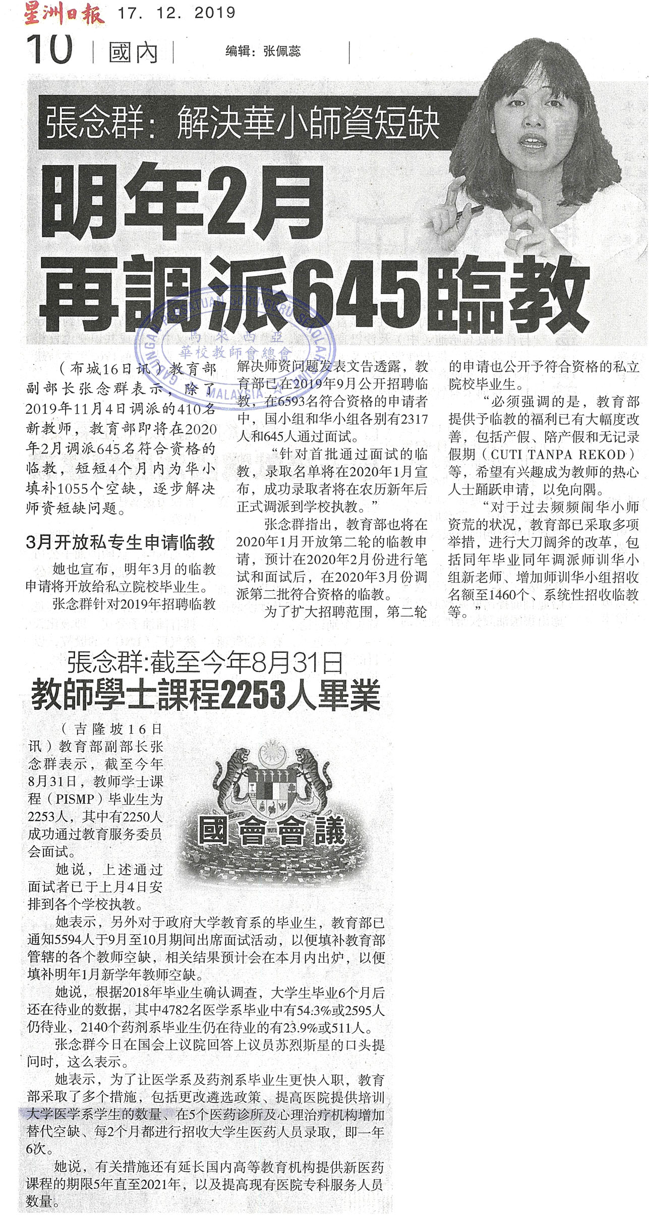 张念群:解决华小师资短缺 明年2月再调派645临教