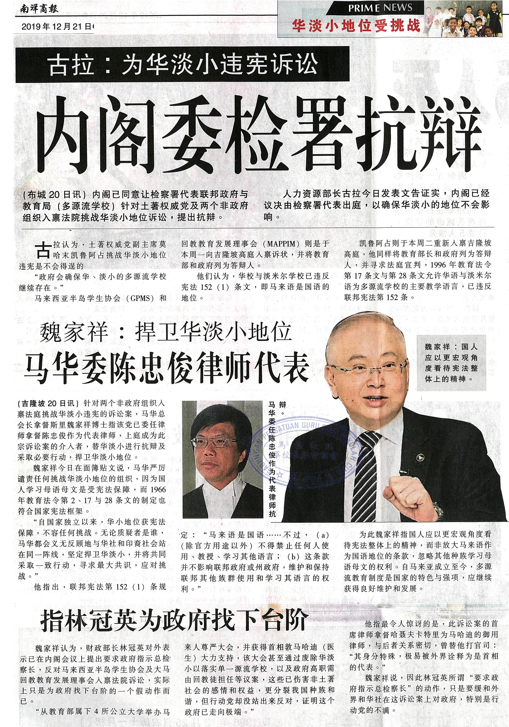 古拉:为华淡小违宪诉讼 内阁委检署抗辩