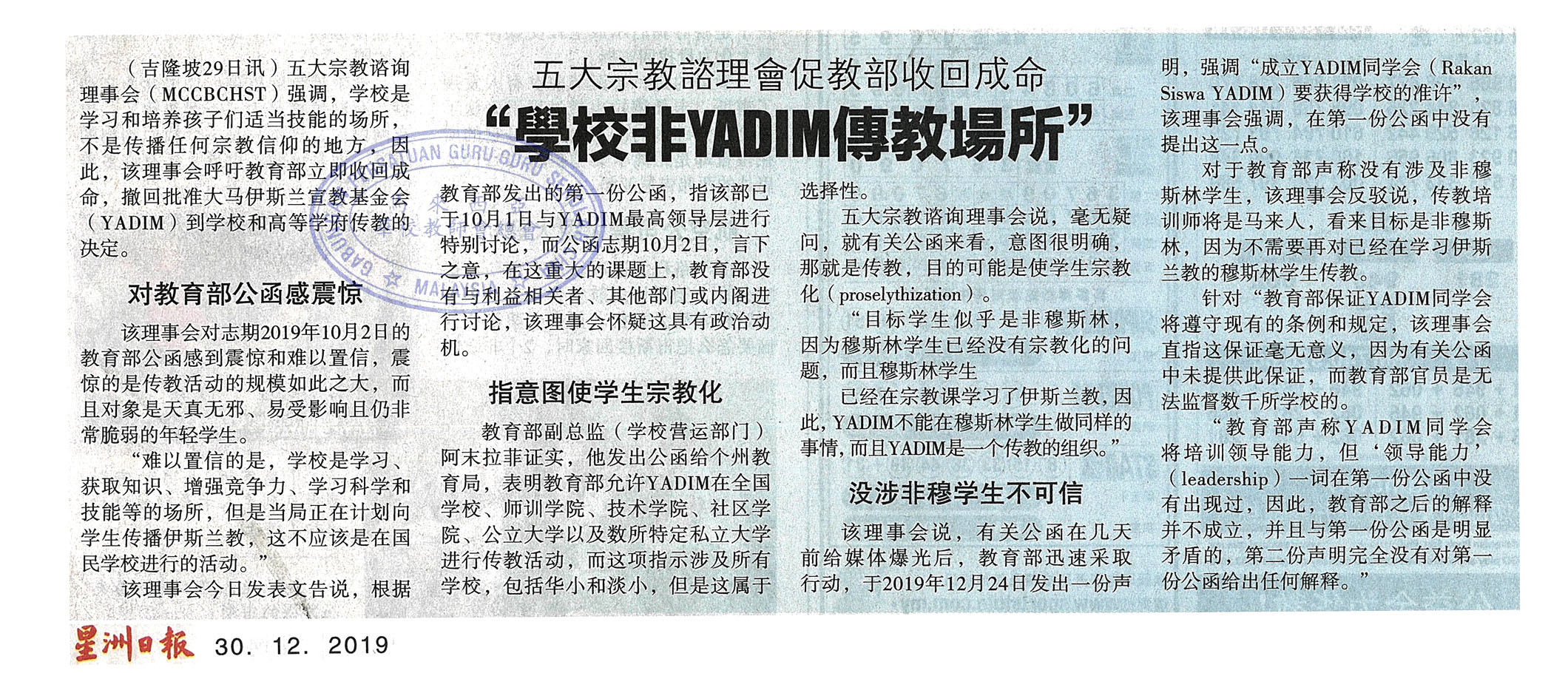 五大宗教咨理会促教部收回成命 “学校非YADIM传教场地”