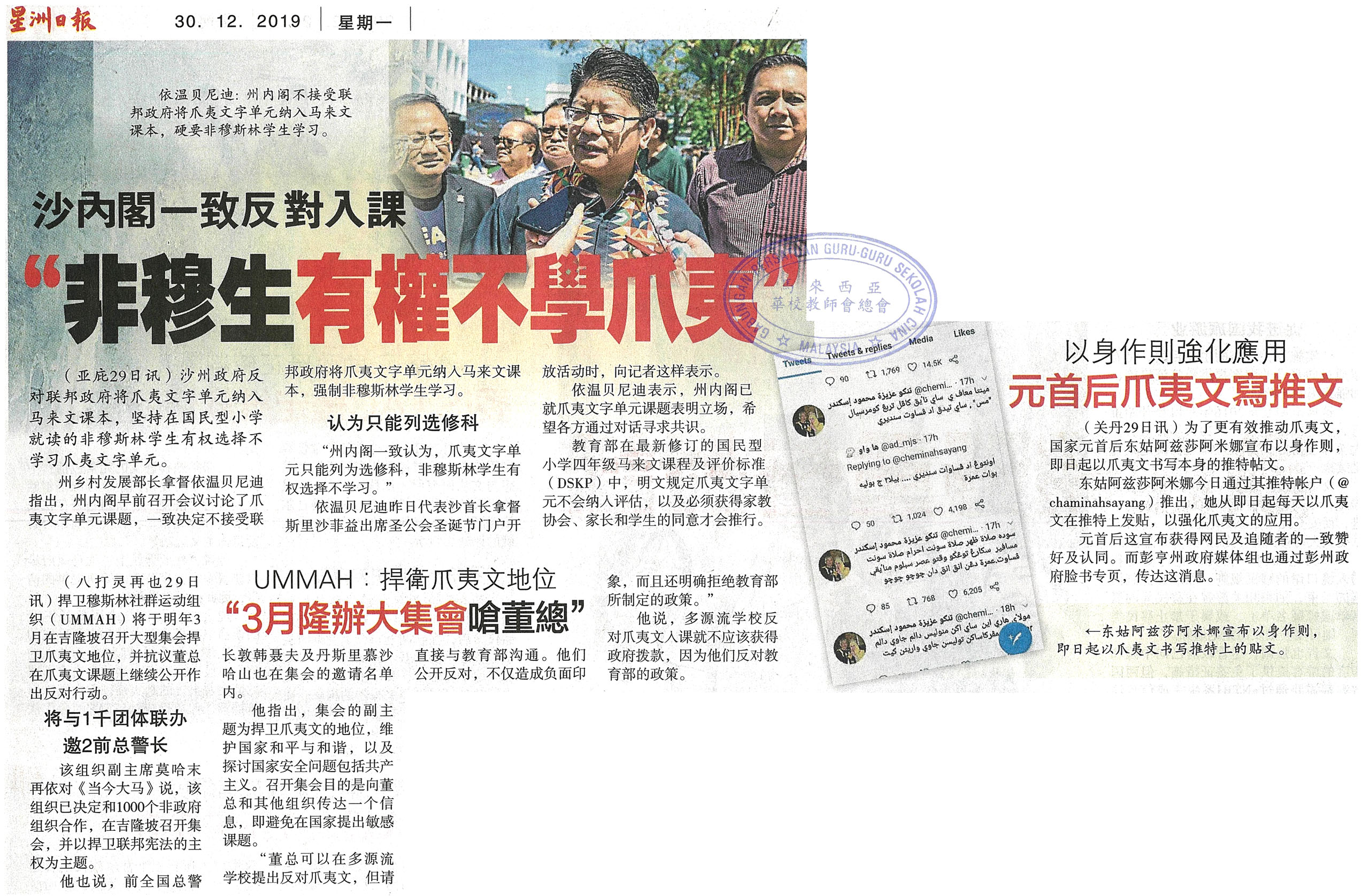 沙内阁一致反对入课 “非穆生有权不学爪夷” WhatsApp 上一篇文章: 星洲社论:爪夷文课题需要更多对话和交流 上一页 下一篇文章: 五大宗教咨理会促教部收回成命 “学校非YADIM传教场地” 下一页