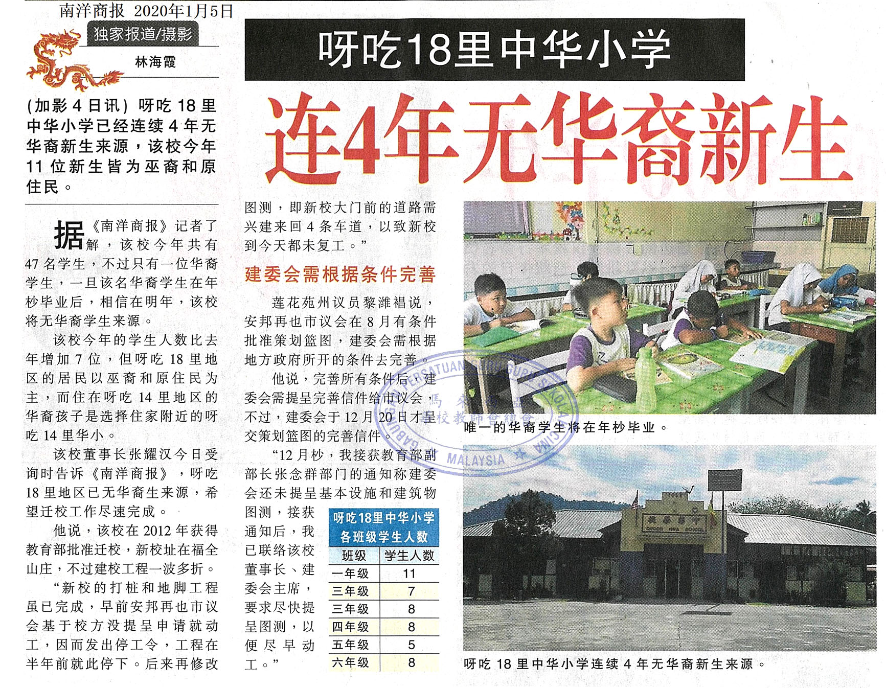 呀吃18里中华小学 4年无华裔新生