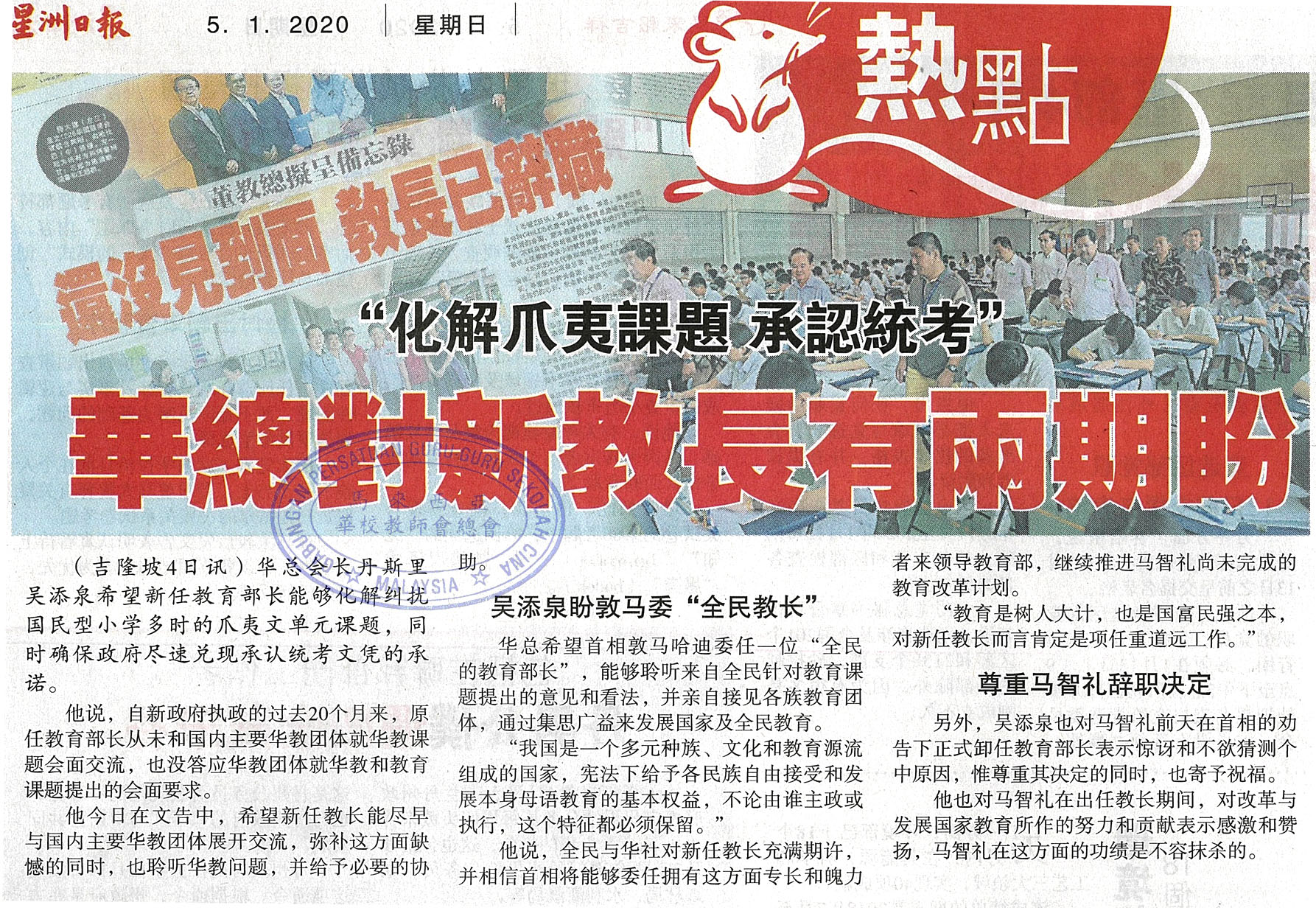 “化解爪夷课题 承认统考” 华总对新教长有两期盼