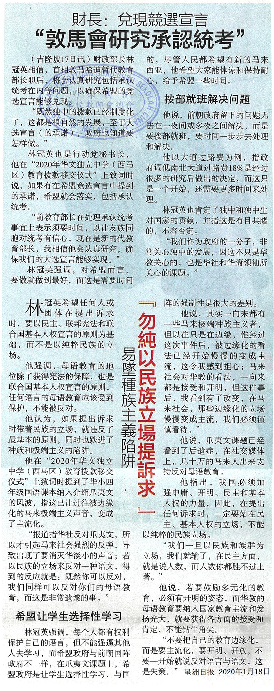 财长:兑现竞选宣言 “敦马会研究承认统考”