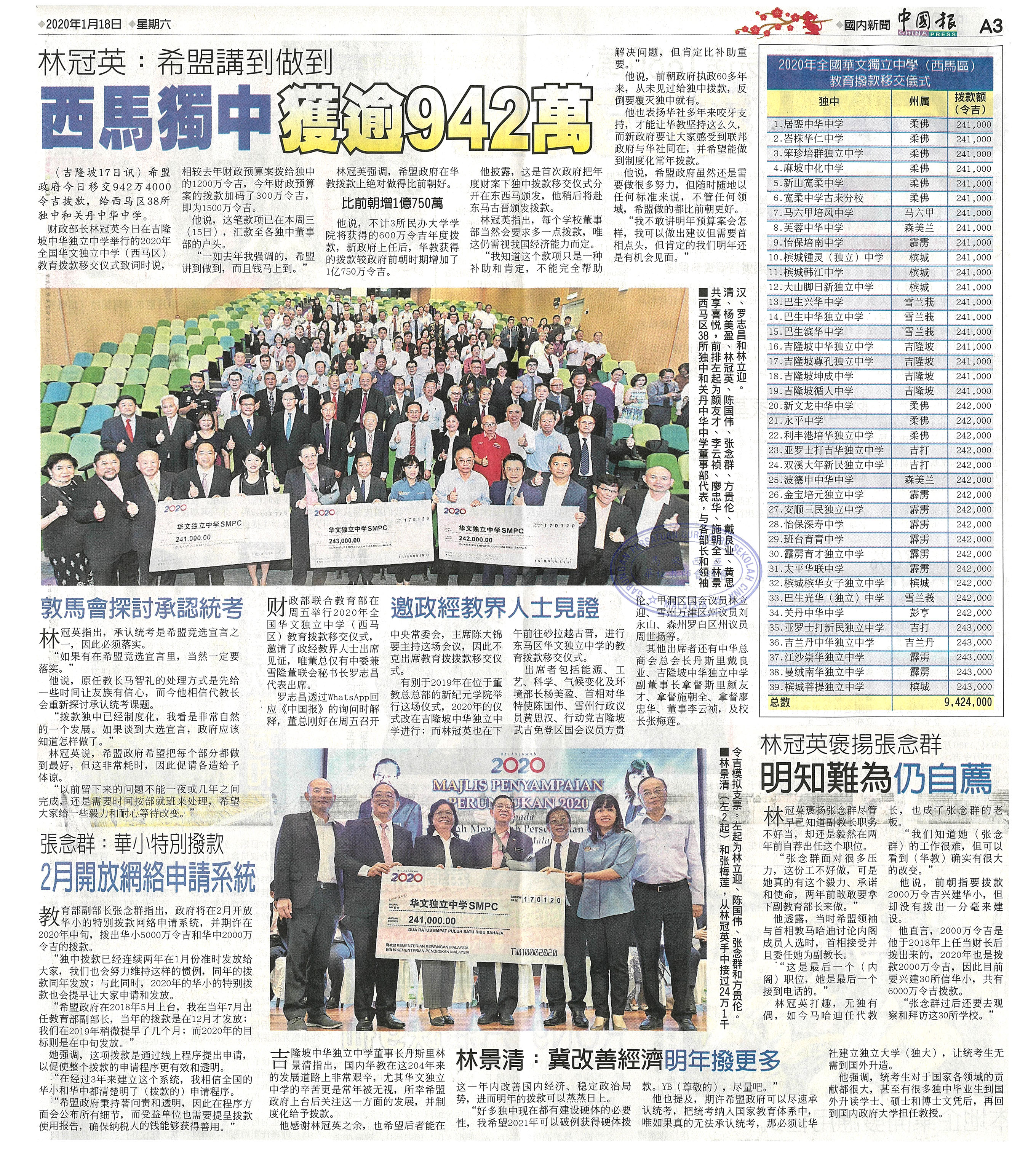 林冠英:希盟讲到做到 西马独中获逾942万