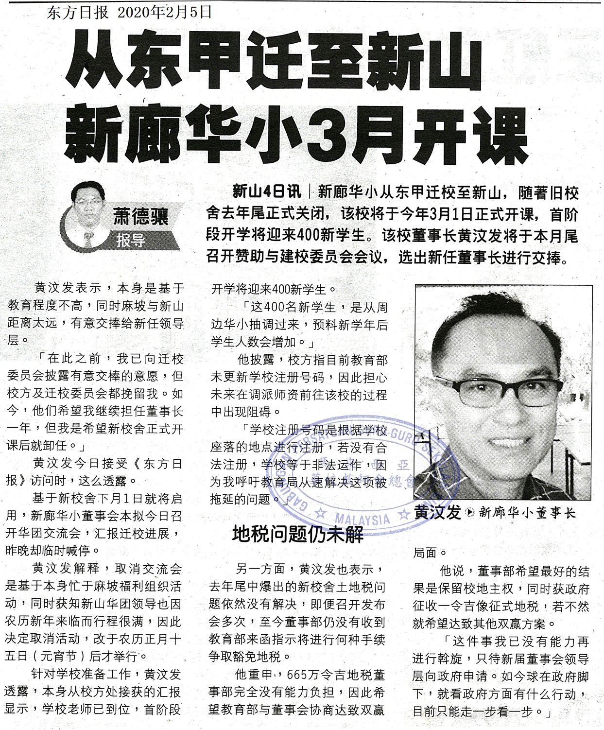 从东甲迁至新山 新廊华小3月开课 WhatsApp 上一篇文章: ILMU STEM LEBIH MUDAH DIKUASAI GUNA BAHASA IBUNDA 上一页 下一篇文章: 董教总:应吸取失败教训 英教数理冲击教育发展 下一页