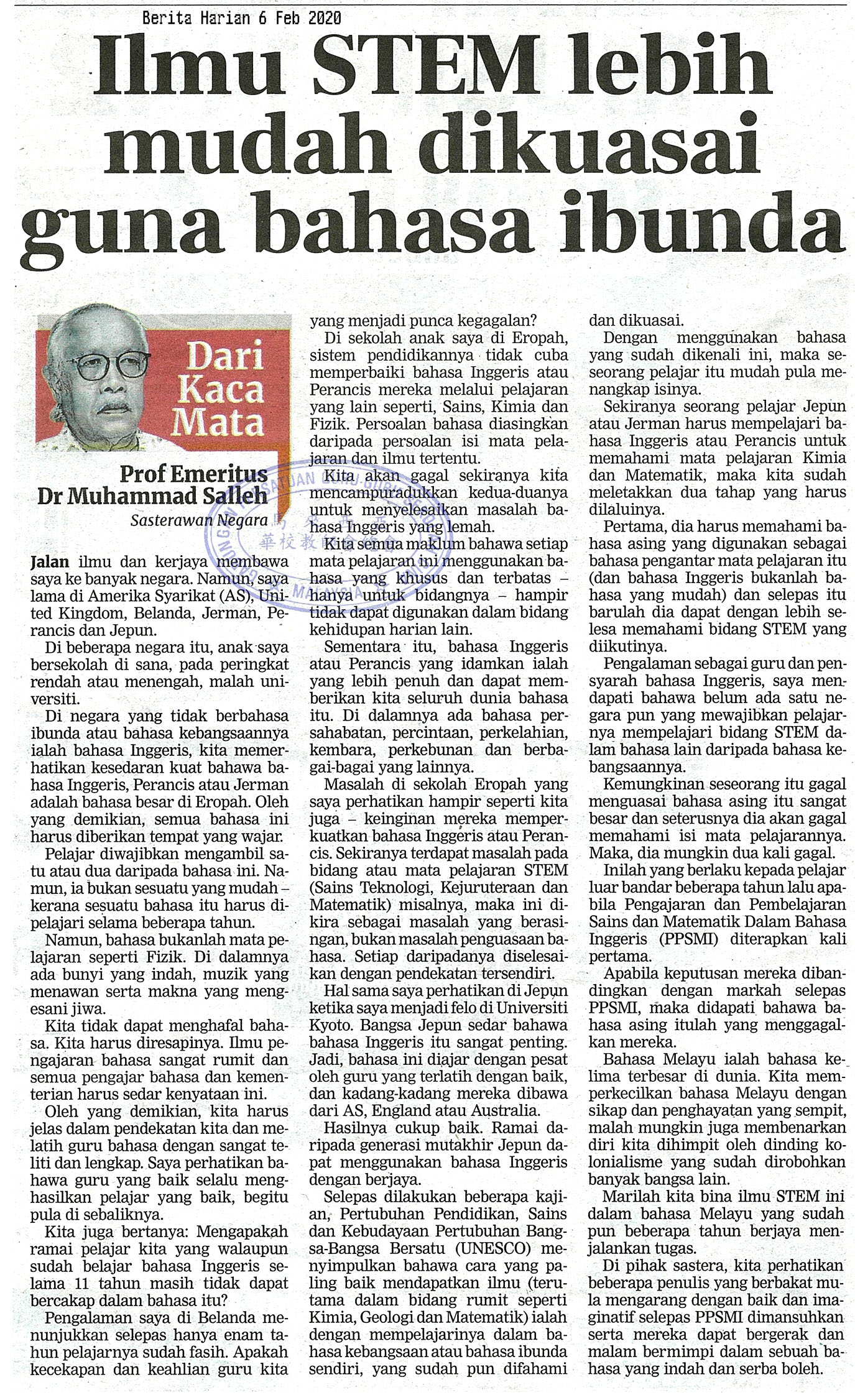 ILMU STEM LEBIH MUDAH DIKUASAI GUNA BAHASA IBUNDA WhatsApp 上一篇文章: 吴添泉:不反对中学执行 不认同华小英教数理 上一页 下一篇文章: 从东甲迁至新山 新廊华小3月开课 下一页