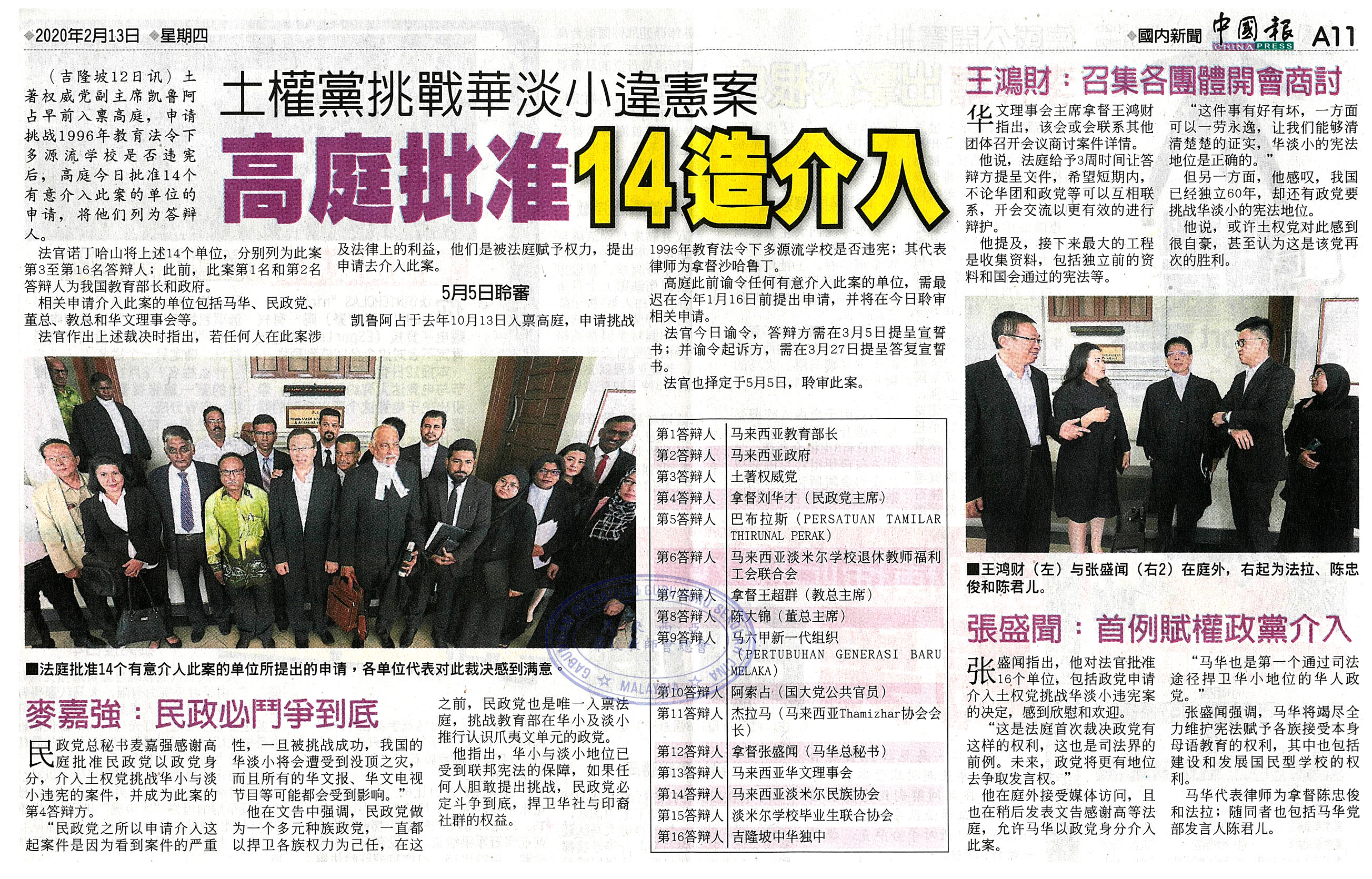 土权党挑战华淡小违宪案 高庭准14团体介入