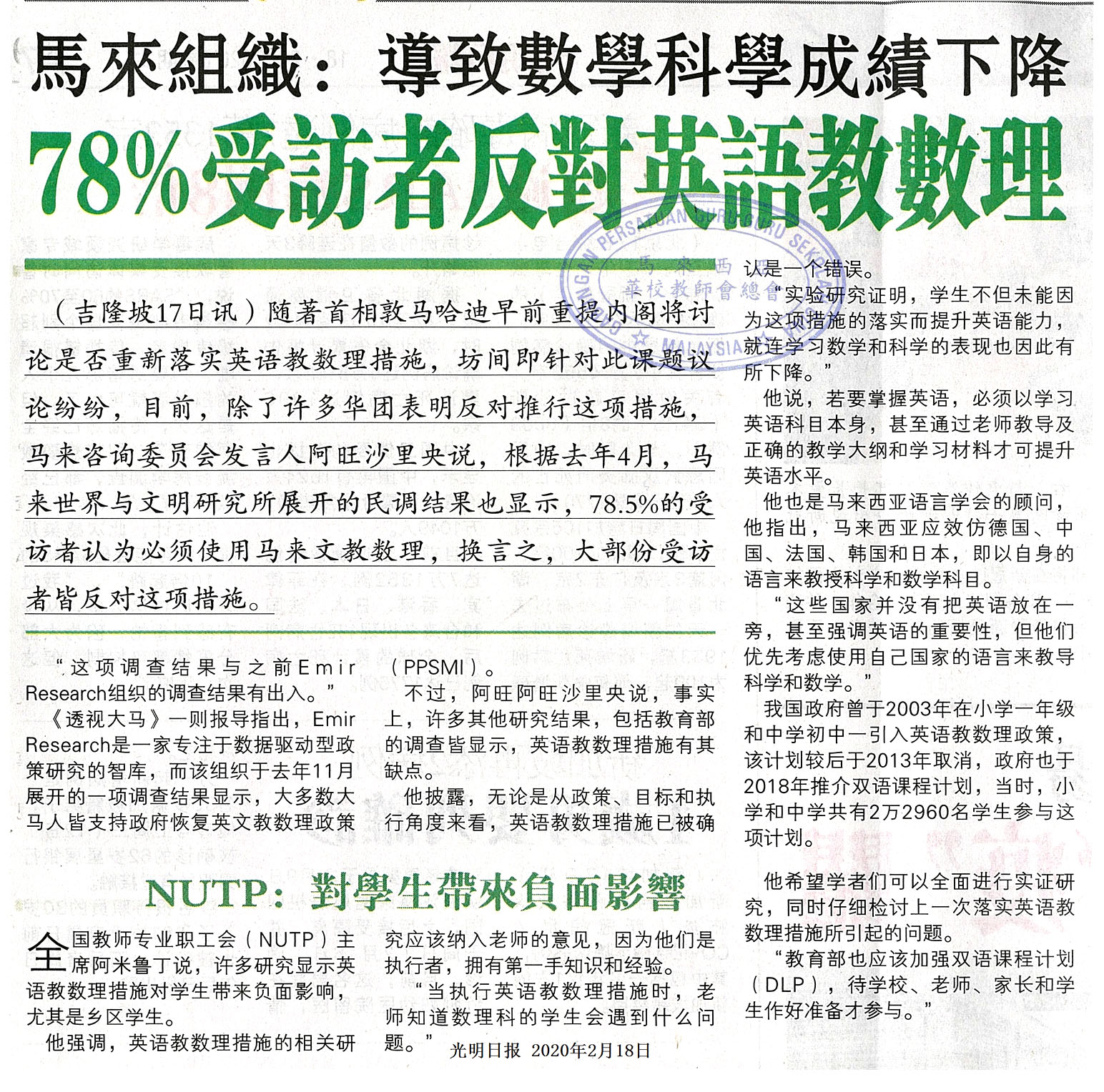 马来组织:导致数学科学成绩下降 78%受访者反对英语教数理