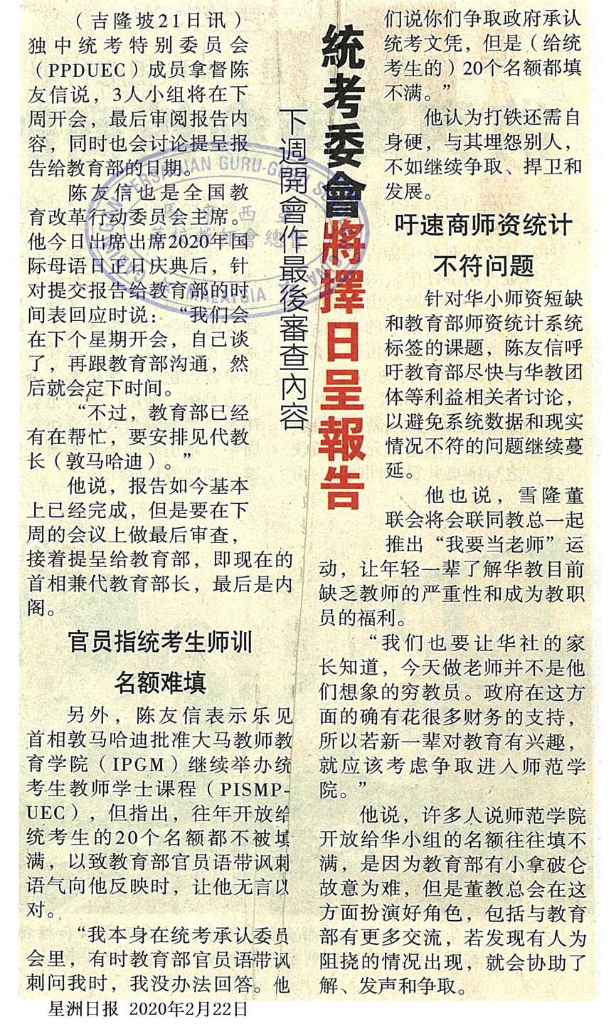 统考委会将择日呈报告 下周开会做最后审查内容 WhatsApp 上一篇文章: 王鸿财:数据不能作准 “过剩7500人”或教其他科 上一页 下一篇文章: 张念群:显示华小华文教师过剩7500 “教部师资系统有疏漏” 下一页