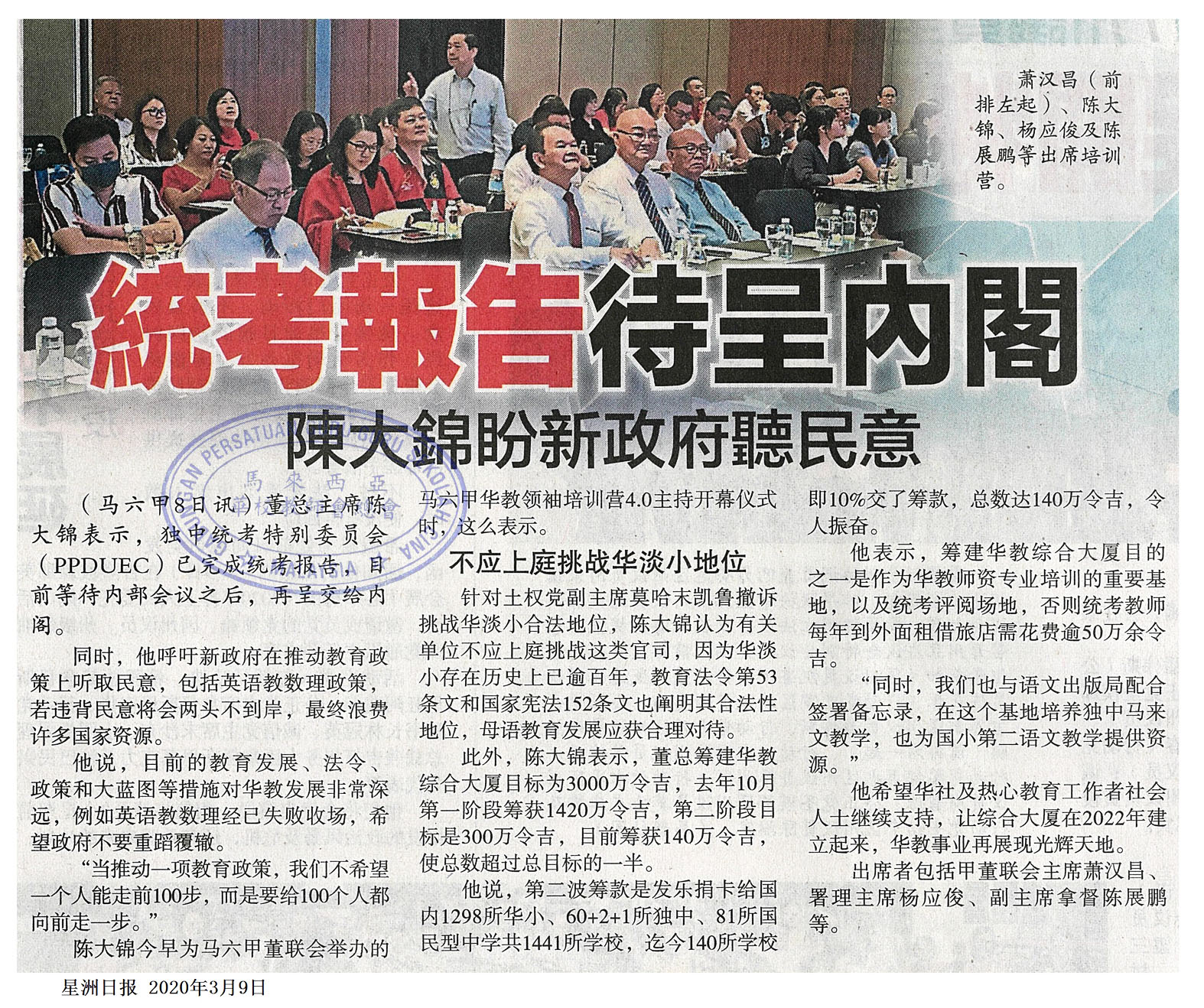 统考报告待呈内阁 陈大锦盼新政府听民意 WhatsApp 上一篇文章: 2造挑战华淡小违宪案 521聆审14造介入申请 上一页 下一篇文章: 今年教师学士课程6千名额 华小华文组 统考生教师 不招生 下一页