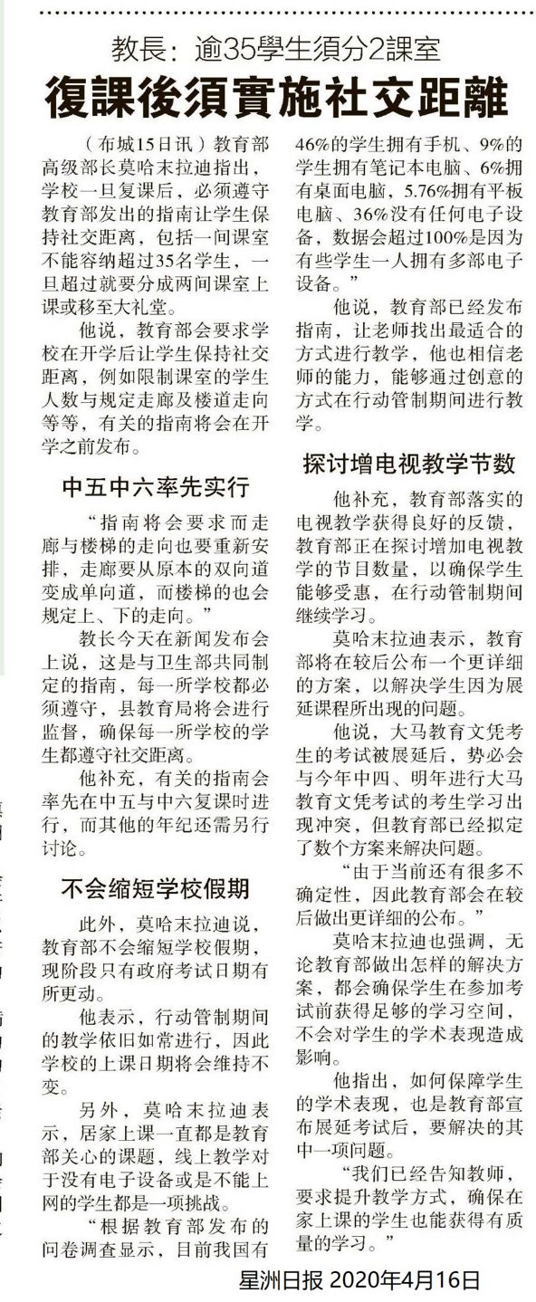 教长:逾35学生须分课室 复课后须实施社交距离