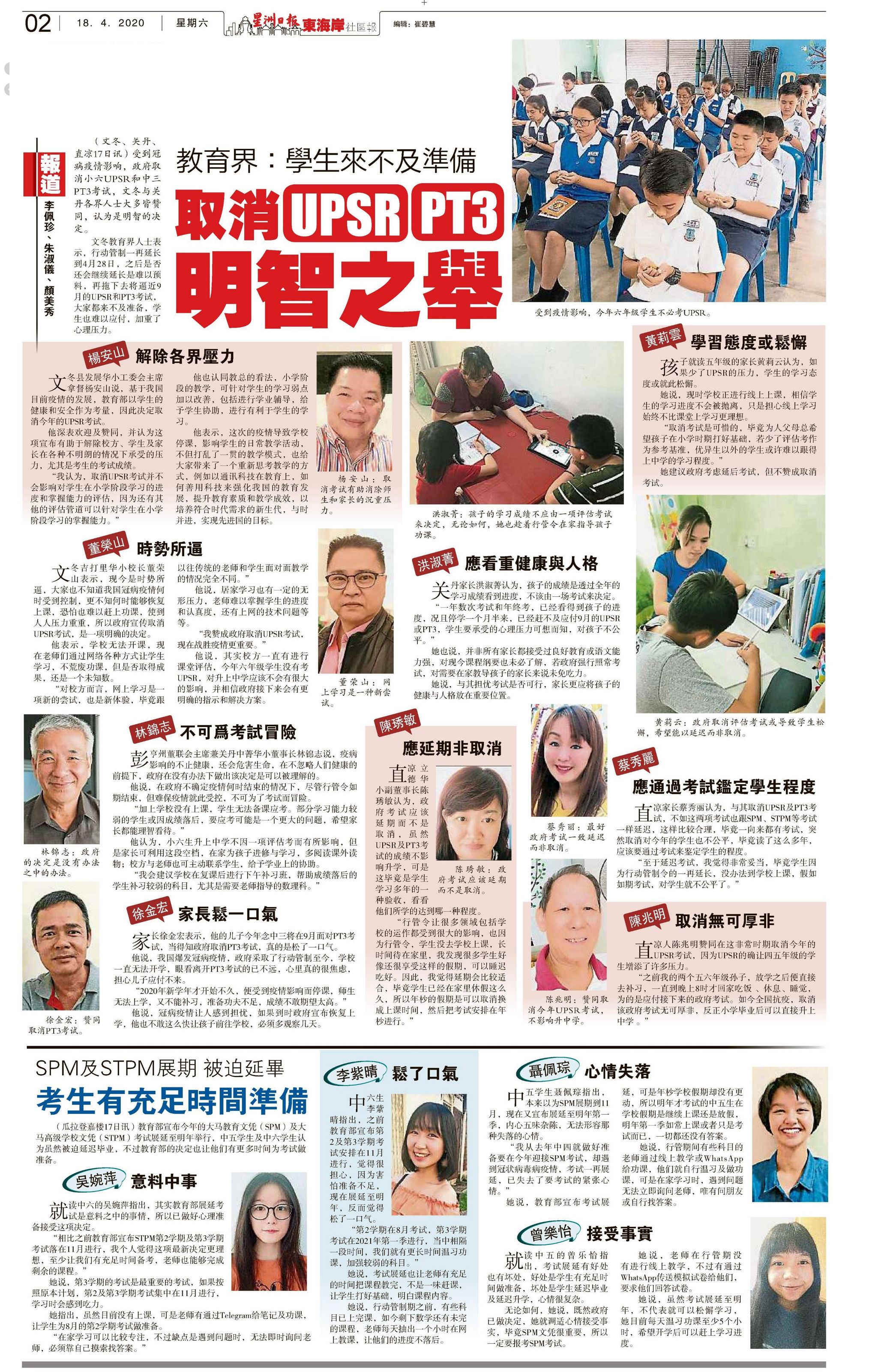 教育界:学生来不及准备 取消UPSR PT3明智之举 WhatsApp 上一篇文章: 复课后课室不能超过35学生 大型学校独中难办到 上一页 下一篇文章: 前副教长:用其他方式评估 取消考试不影响学习 下一页
