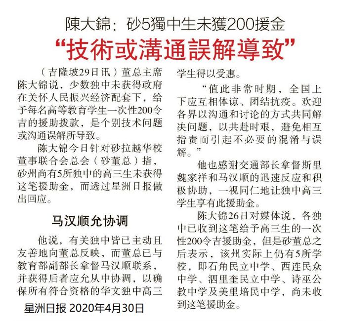 陈大锦:砂5独中生未获200援金“技术或沟通误解导致”