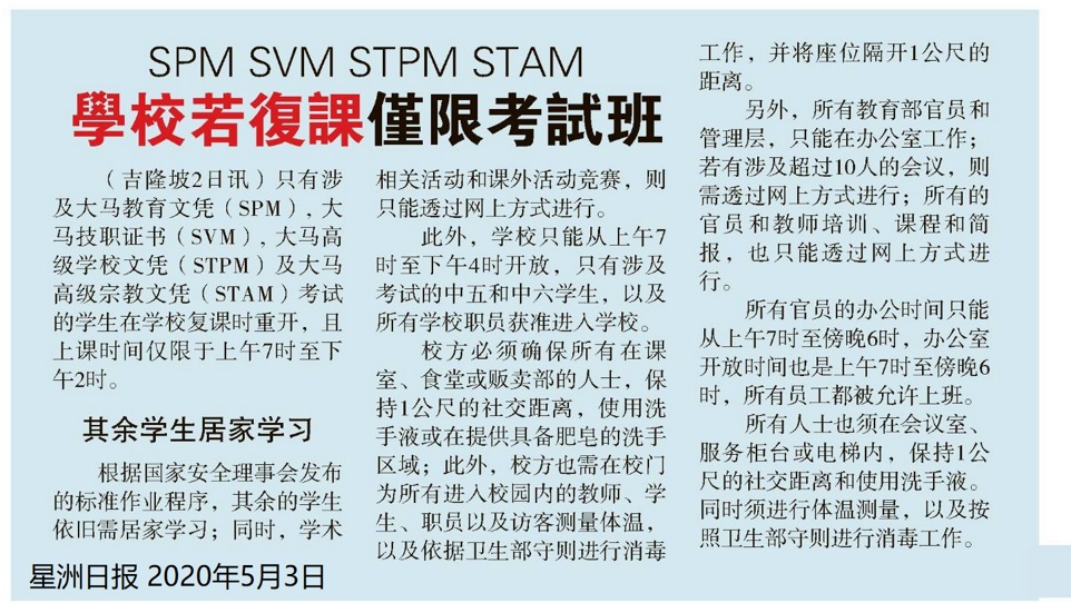 SPM SVM STPM STAM学校若复课 仅限考试班