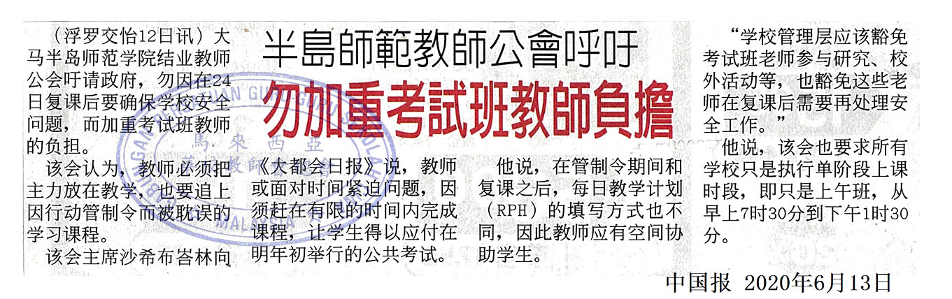 半岛师范教师公会呼吁 勿加重考试班教师负担 WhatsApp 上一篇文章: SOP BUKA SEKOLAH DINILAI BERTERUSAN, TAK BEBAN GURU 上一页 下一篇文章: 分阶段减低管理压力 独中高二高三先复课 下一页