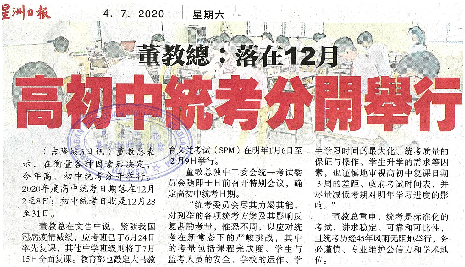 董教总:落在12月 高初中统考分开举行