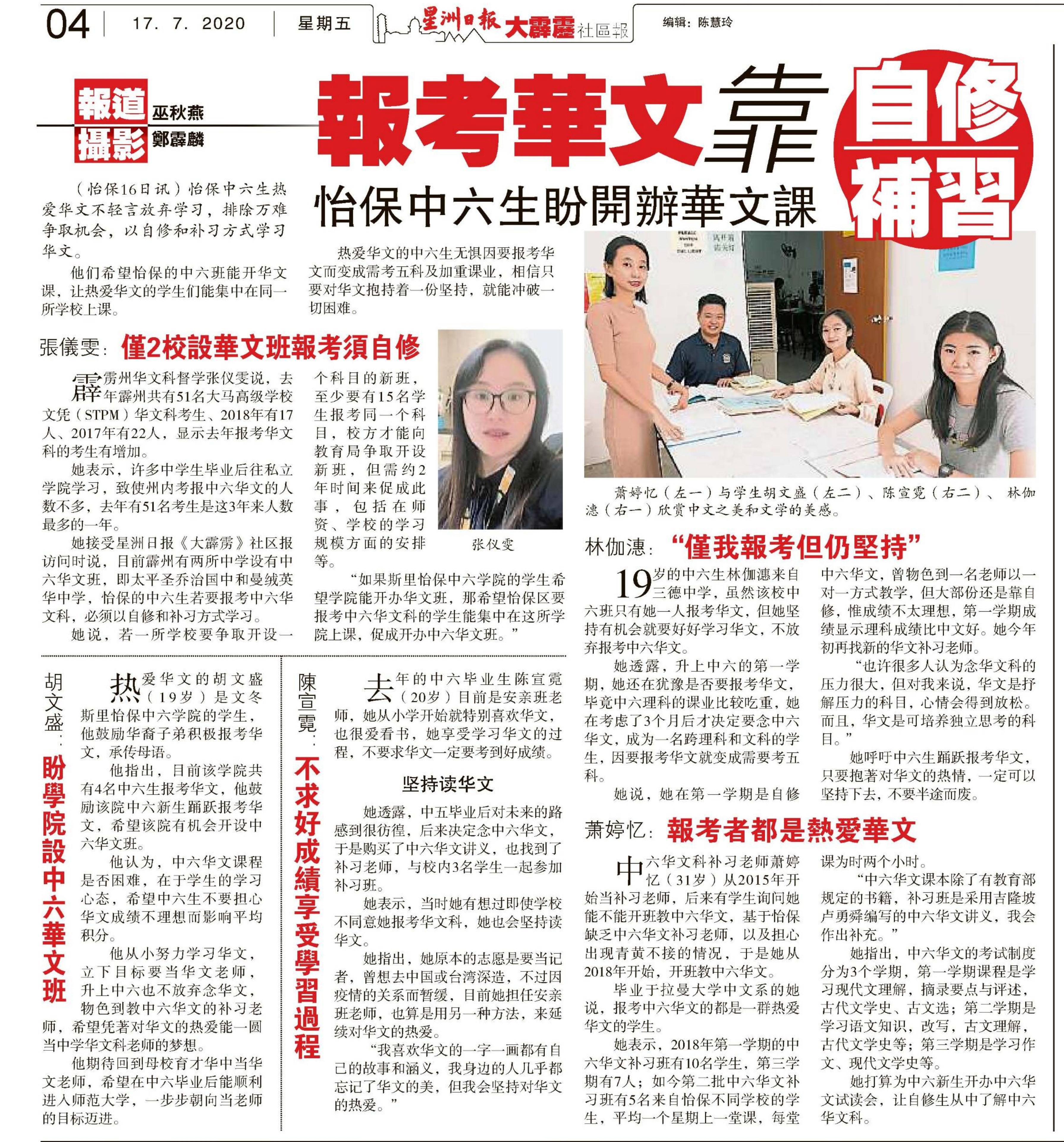 报考华文靠自修补习·怡保中六生盼开办华文课