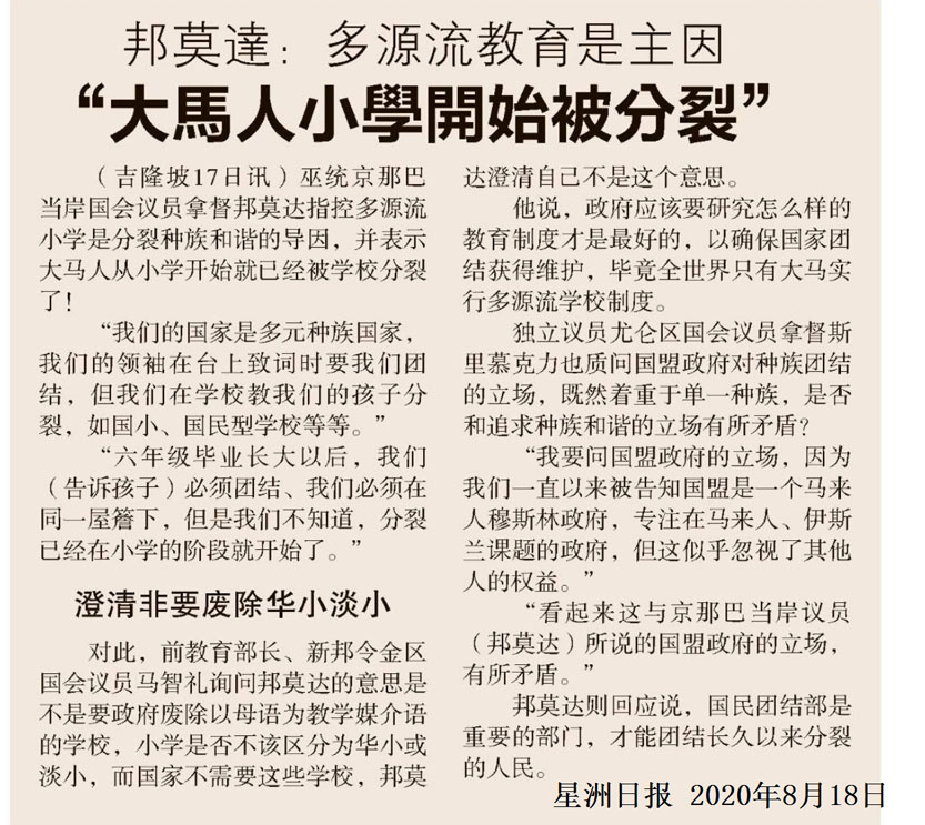 邦莫达:多源流教育是主因 大马人小学开始被分裂