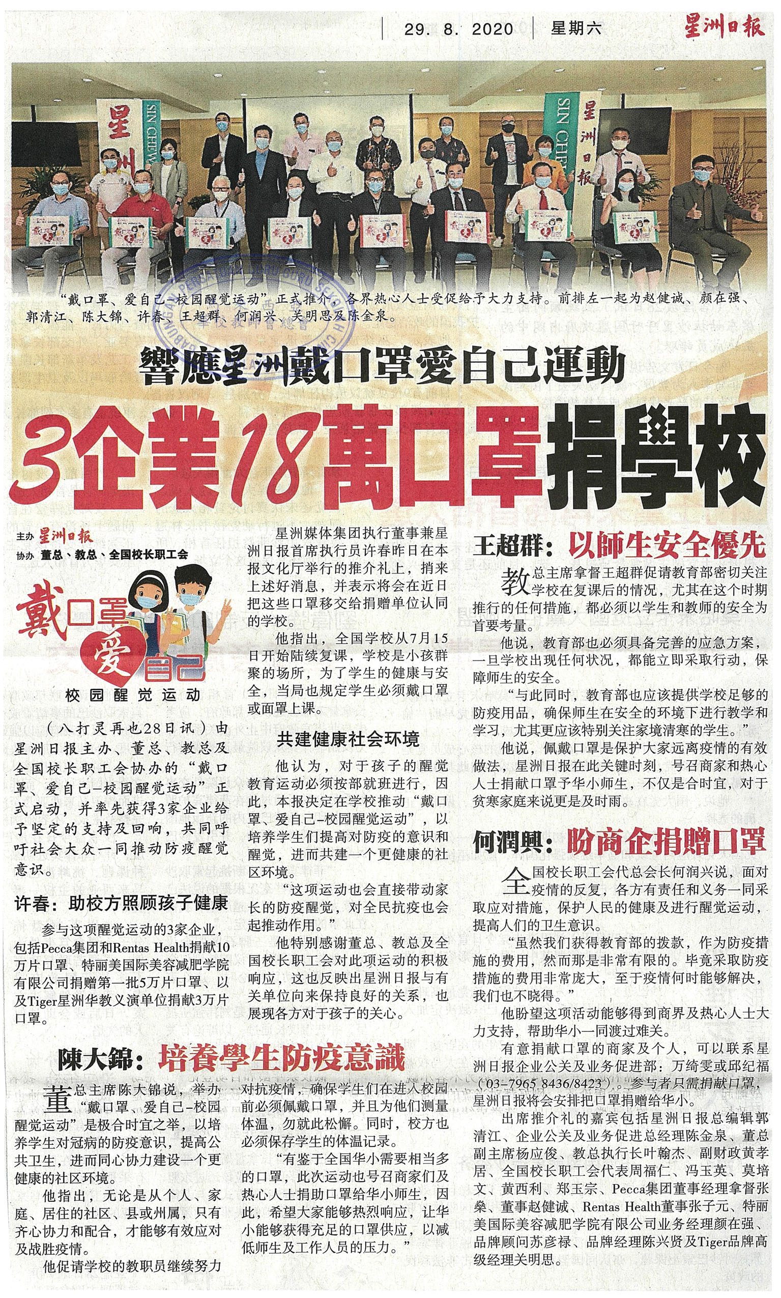 响应星洲带口罩爱自己运动 3企业18万口罩捐学校