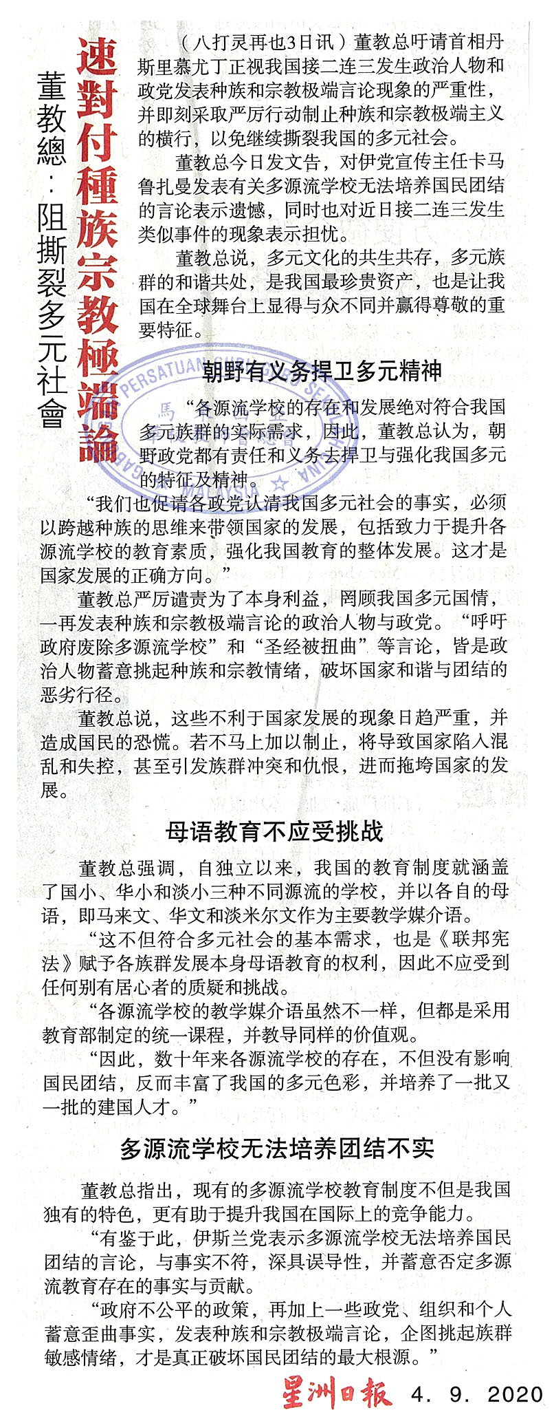 董教总:阻撕裂多元社会 速对付种族宗教极端论 WhatsApp 上一篇文章: “母语教学培养团结失败” 伊党促修改多源流学校制度 上一页 下一篇文章: “恒中二校申请被搁置” 张念群:国盟惩师生非希盟 下一页