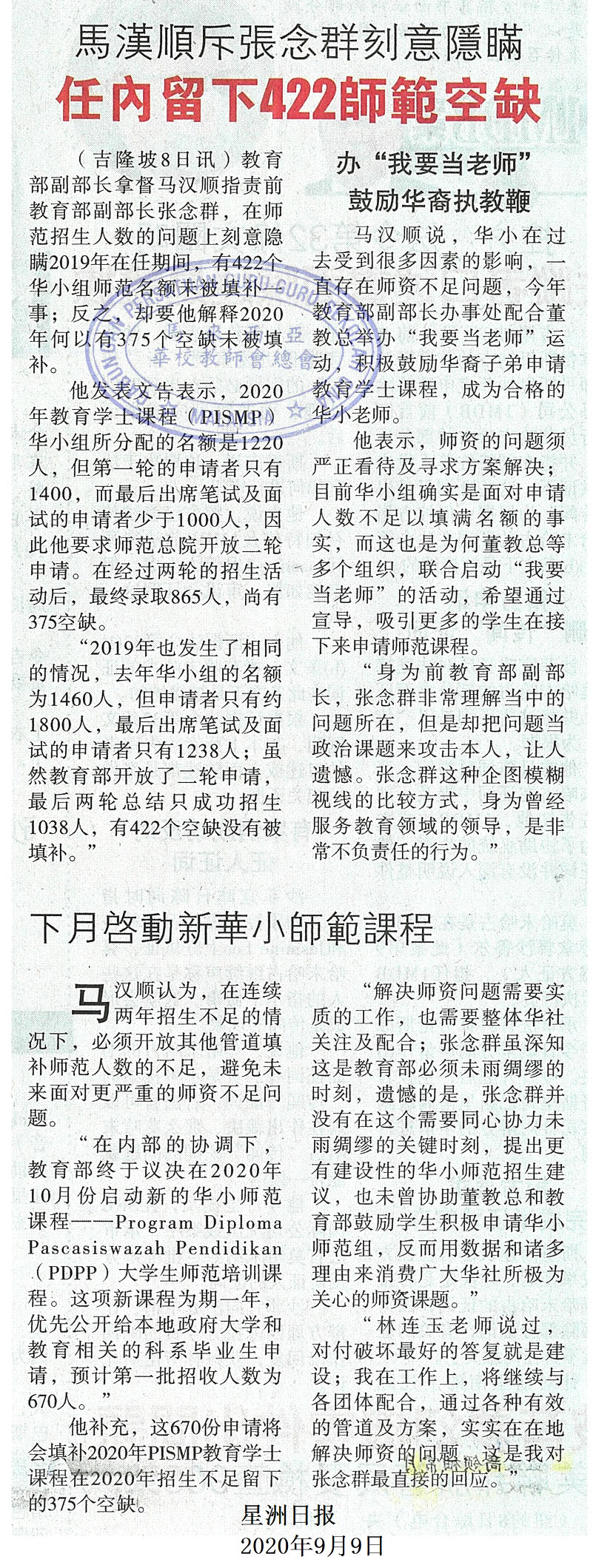 马汉顺斥张念群刻意隐瞒 任内留下422师范空缺