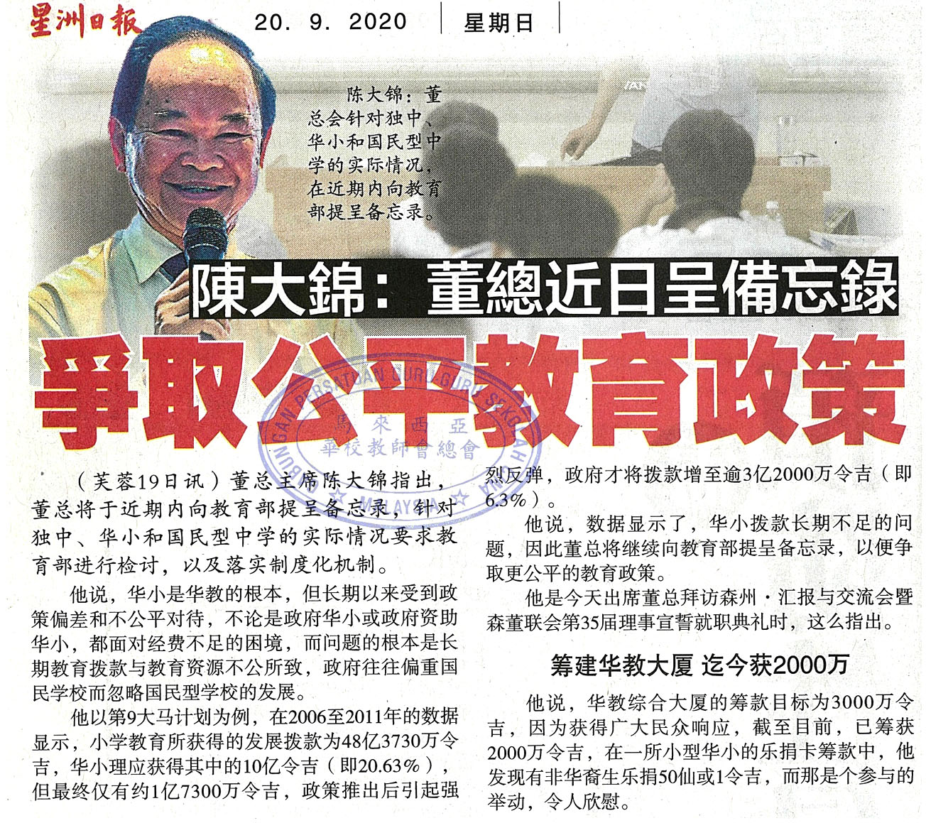 陈大锦:董总近日呈备忘录 争取公平教育政策