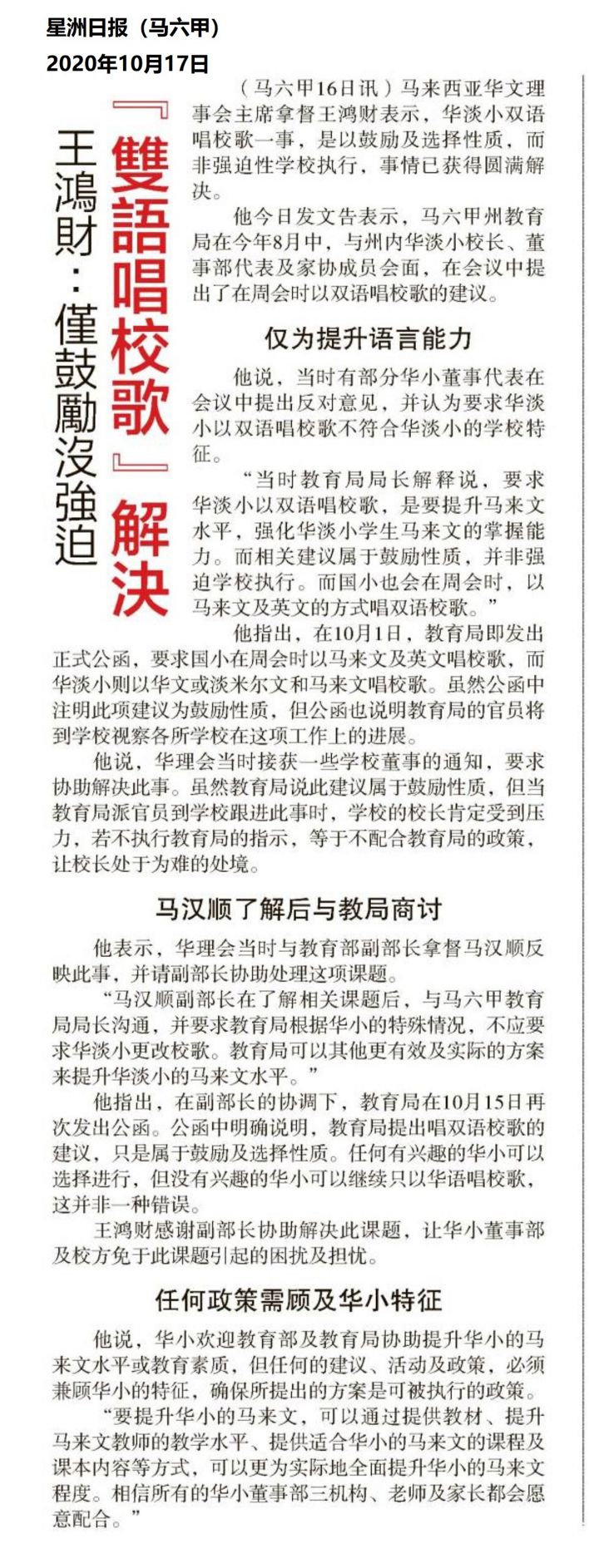 王鸿财:仅鼓励没强迫“双语唱校歌”解决