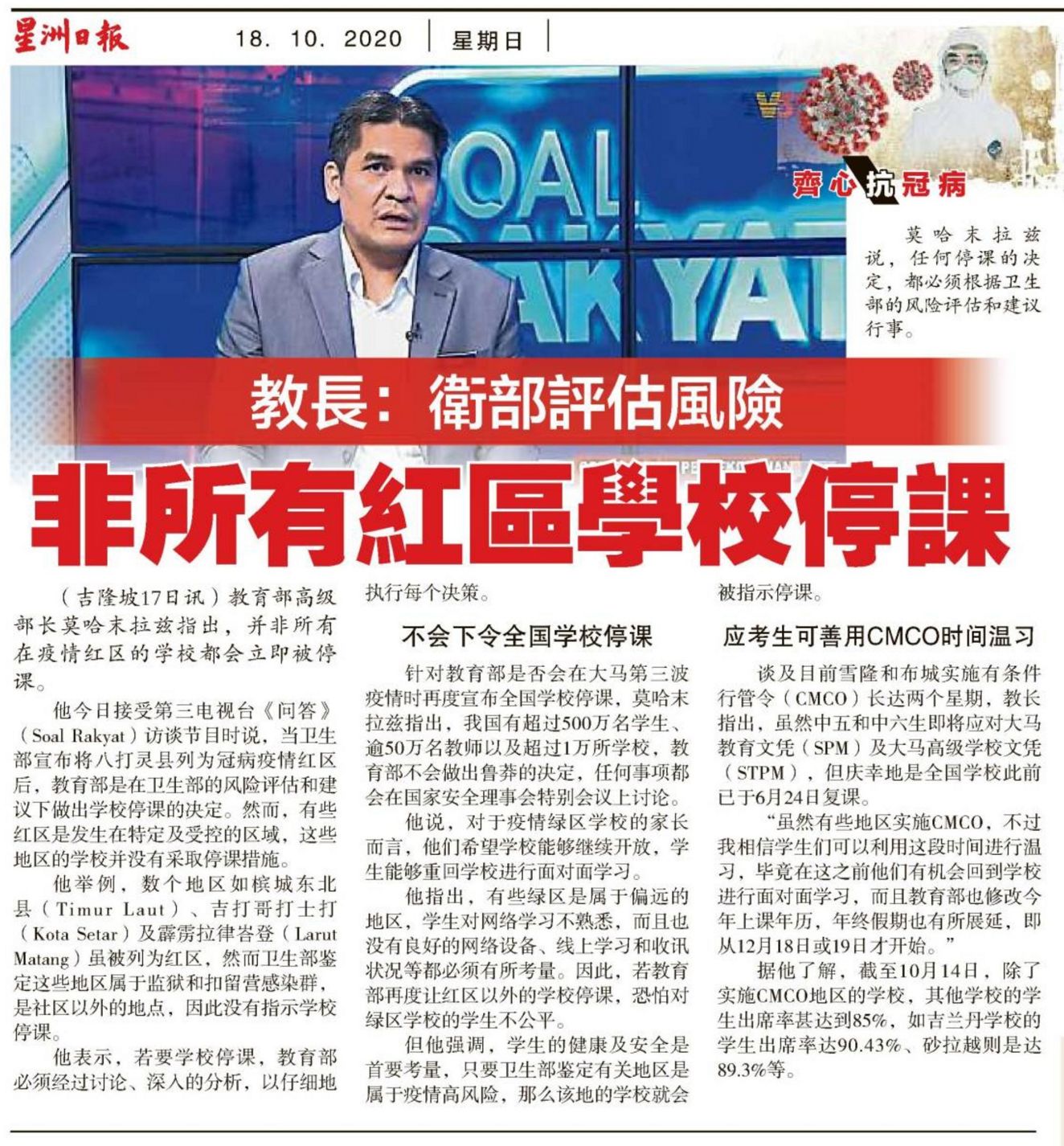 教长:卫生部评估风险 非所有红区学校停课